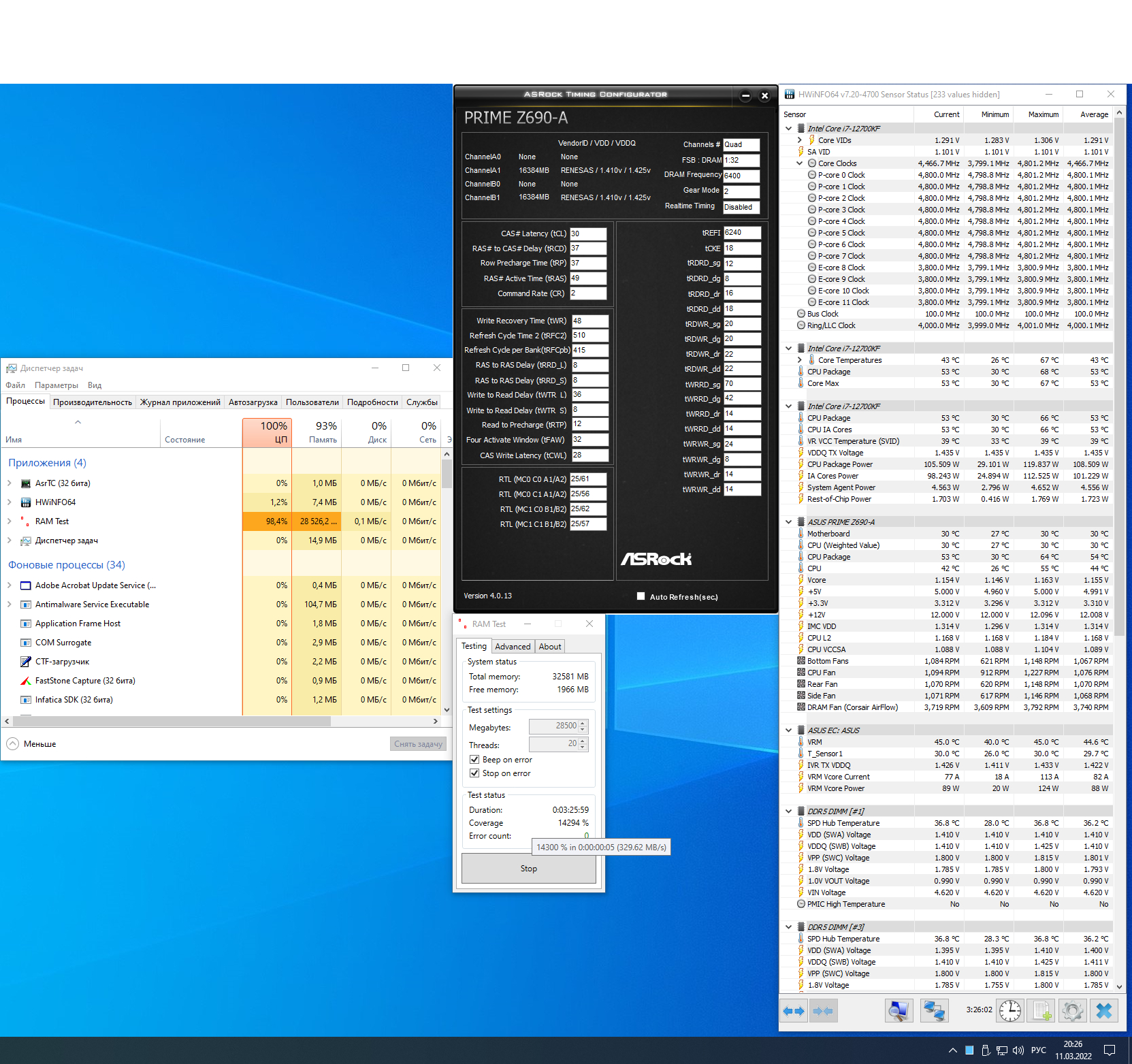 Проблема с планками исключается - они были прогнаны до 6400-36 на другой системе, как говорил выше. Проблема материнки? Проблема очень плохого экземпляра 12700К? Проблема Биоса и остается просто ждать?
