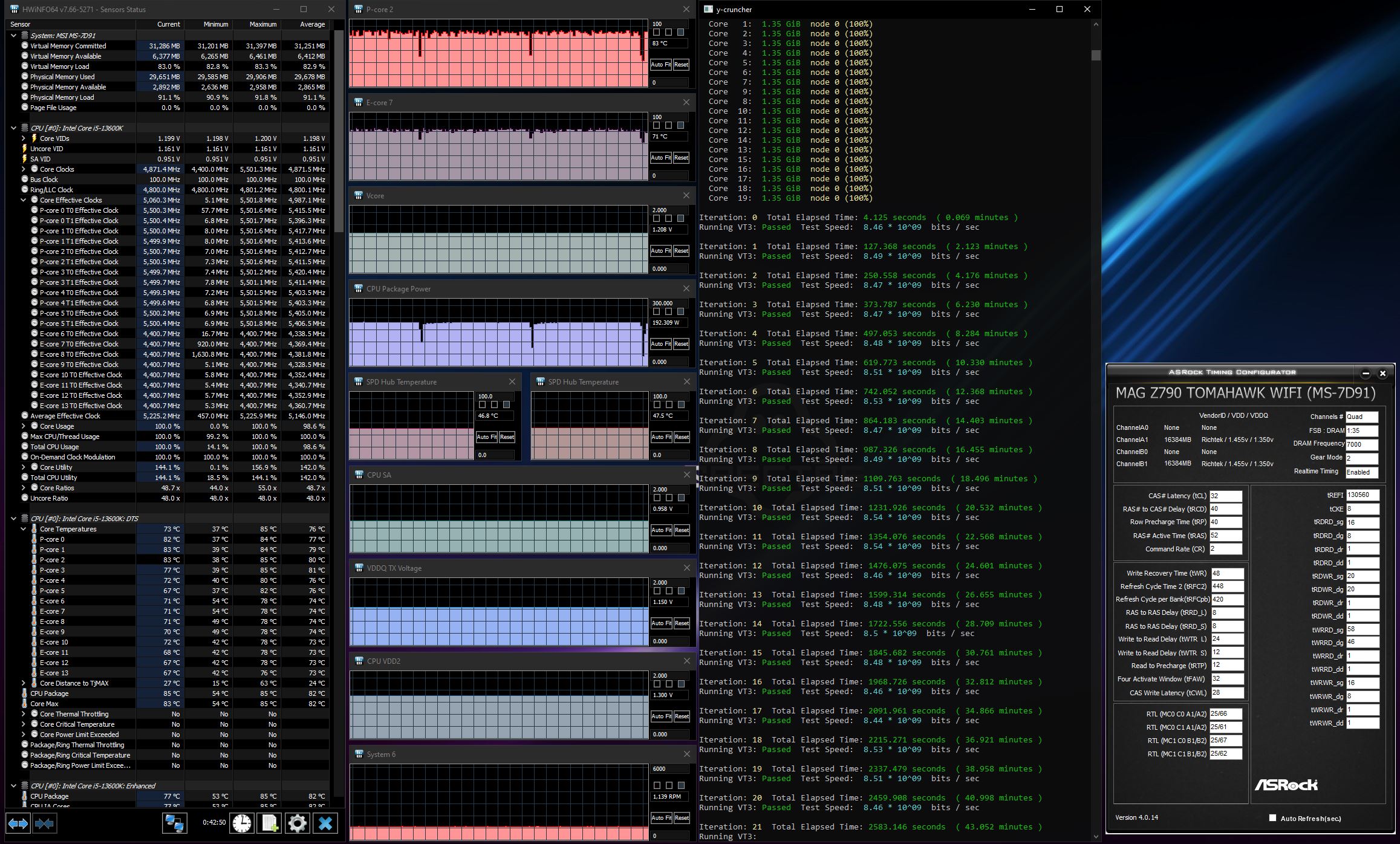 Пробил минимальные рабочие вольтажи для конфигов 58-45-50 (16) и 60-45-50 (16). С 58P требуется 1.300В BIOS (1.290В актуальный), для 60P требуется уже порядочный буст: 1.450В BIOS, 1.430В актуальный.