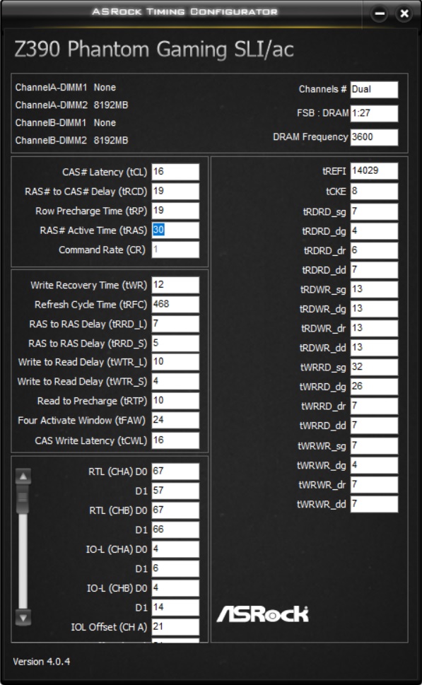 спасибо. достаточно подробно. 1. ccdl я как понял это rrdl. rdrdsg у меня не равно wrwrsg, я это брал из таблицы анта777. Всегда нужно семь ставить и от чего зависит? 2. нашел на первых 100 страницах этой темы, что rtl(a)=offset(a)+iol(a)+2tcl rtl(b)=offset(b)+iol(b)+2tcl+2, так ли это? 3. У меня на руках мой комп и комп друга. В обоих системах 4 планки, мало ли ты не учел, может это важно. 4. на моем экстриме впринципе цифры как у тебя адекватные, но не по формуле(написал выше про нее), собственно как и у тебя, значит нормально, хотя бы иол не 14. А вот на формуле 11 у товарища дубовые планки старые хайпер 4133 19-23-23-45. Я их 100 пудова запускал 17-19-19-37 4000, они проходили тесты не однократно, еще в старой хиро 10. дак вот на его планках иол уже 14, и не снижается зараза, и руками что бы я не прописывал, даже действующие настройки - бесконечно бегают посткоды, mrc - disable, mch - enable. 5. еще хотел узнать что на счет максимус твик мод1 и мод2 если ты знаешь про это на асусе. на мод 2 у меня адекватные иол, но на мод 2 не стартуют частоты хорошие. на мод 1 частоты хоть 4400, но иол безобразный. 6. и я не понял формулу в шапке. откуда этот иол брать? он по дефолту 4? много навалил на тебя текста, сорян. Просто в бошке это все не укладывается, последние 3 дня плотно налегаю, не могу многого понять еще...