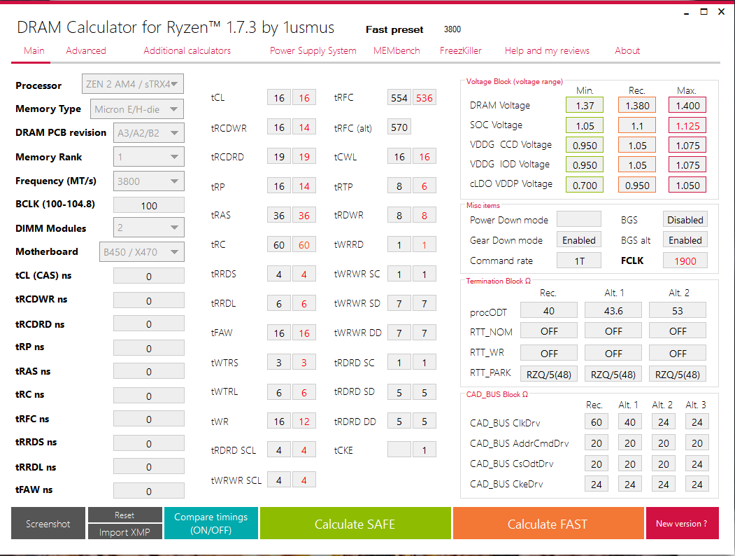 Есть у меня два рабочих сетапа 3666 и 3733 цл16 - проверенные временем и всевозможными тестами, но вчера заглянул в эту тему, увидел новую версию калькулятора, настроил спокойно 3200 цл14, которую ранее ни одной версией калькулятора настроить не мог, и это на 1.36 вольтах + проходит все тесты, далее решил попробовать максималку в 3800 и получил облом ))) Вот, думаю, постараться настроить 3600 цл14 и на этом все....