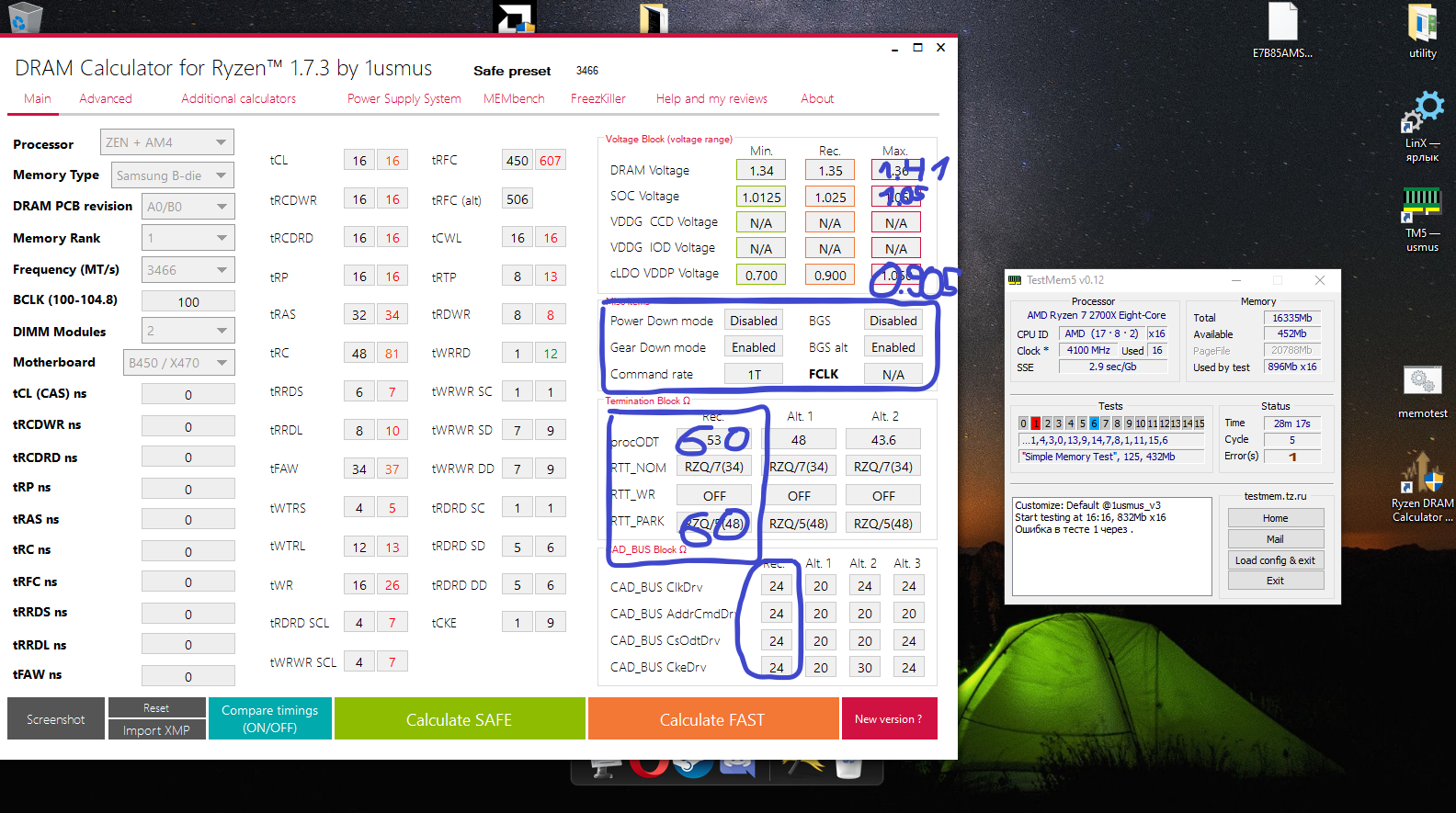 4. Перед настройкой частоты и таймингов рекомендуется установить принудительное охлаждения на модули памяти, особенно для памяти с чипами Samsung B-die, повышение температуры памяти выше 48°, может сопровождаться дополнительными ошибками, не связанными с неправильной настройкой таймингов, что затруднит их поиск и общую настройку памяти.