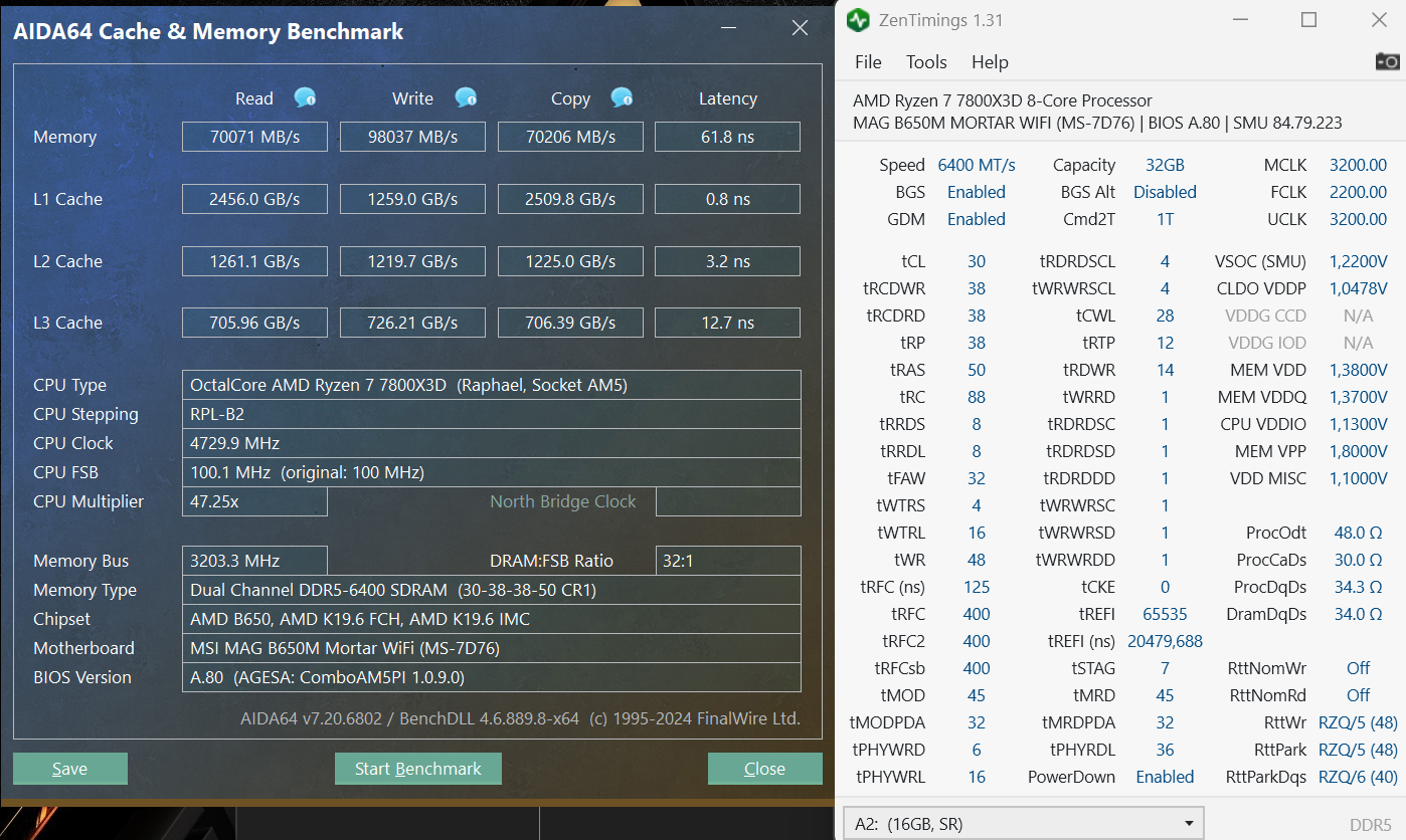 Всем привет! Стал обладателем 9800x3D, перешел на него с 7800x3D, который стабильно работал на FCLK 2200, троттлинг на нем я не замечал, чем бы не проверял. Система не менялась, память и МП те же, в общем изменился только проц. BIOS обновленный до последней версии AGESA PI-1.2.0.3a Patch A. Внизу тесты на 7800 и 9800. Не могу настроить FCLK на 9800, как только включаю, хоть 2033, хоть 2200, ПК перестает стартовать. После включения VDDG CCD/IOD 1.05, система грузится, но спустя 1-30 мин выдает ошибку в Karhu RAM Test. Что нужно "выкрутить", что бы не было ошибок?