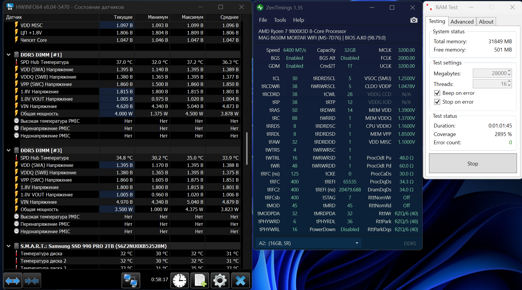 Warleus Так это у вас наверное переразгон шины. Проц ещё с 3д кешем , сам по себе горячий , плюс вы память, шину, soc разогнали в экстрим режиме. Вот мои стабильные 6400 cl28 на 1.5 V , там у вас ещё напряжение VDDIO неверно