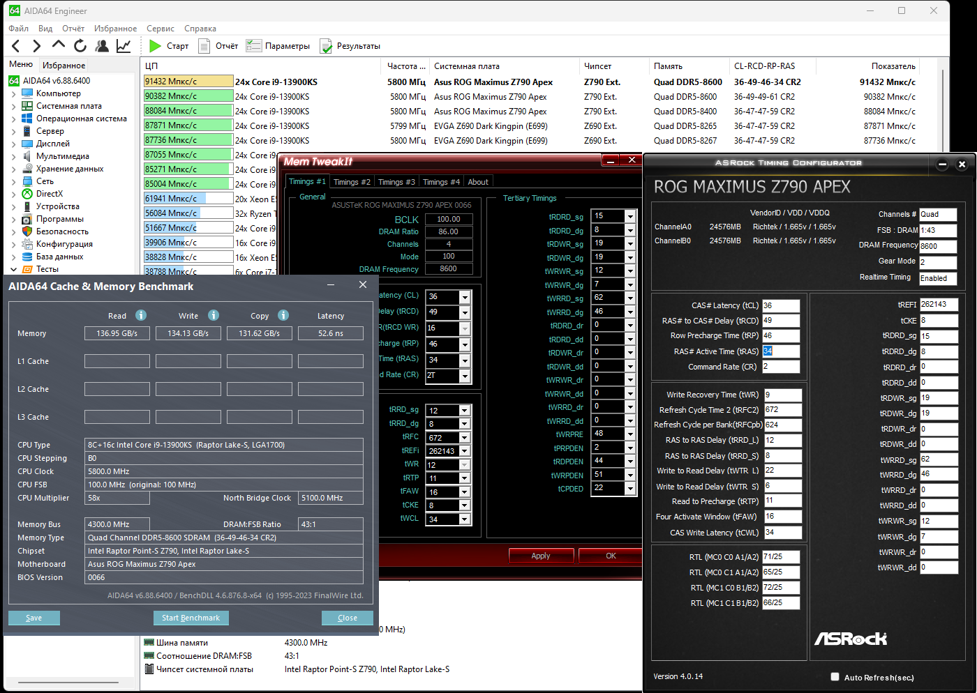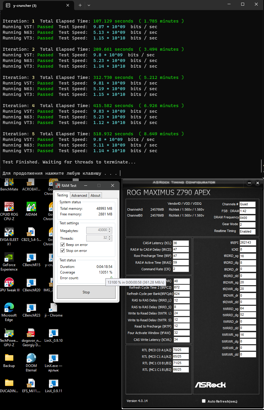 У меня жскилловские 2х24 8000 сразу же легко поехали 8400, практически на автонапряжениях, на белом асусе А04+13900KS (SP чуть ниже среднего) Доберусь до скринов, выложу - не помню то ли 15 минут, то ли полчаса крюнчера N63+VST+VT3 и 7 часов рамтеста с включенным кэшем... На евге 690 реально абсолютный стаб был с этим же процессором и этими же плашками только на 8000с36-47.. Сейчас собрал обратно сборку на евге, пытаюсь сделать-таки на ней 8200с36 или 8000с34-47-16-45... У этих новых м-даев проблемы только с tRCD (tRP можно ниже гораздо) и tRRD_L (ниже 12 никак) Нашёл в телефоне скрин с 8400, ничего особенного, по классике...