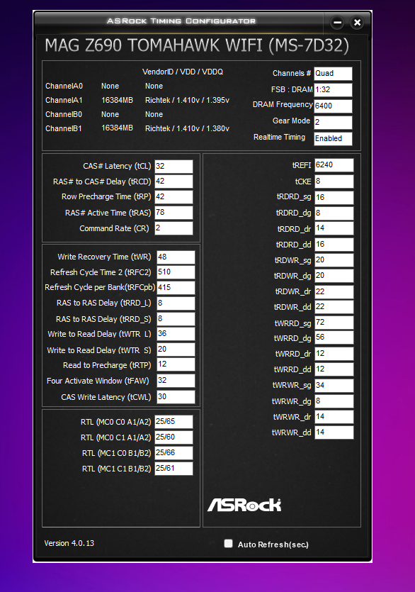 и tREFI понизьте до 30448 или ниже, даже если плата сама ставит 32767. скорость памяти, заявленная производителем платы 7800. TREFI=7800*7.81/2= 30459 - MOD(30459 / 16) = 30448. (это число, делимое на 16 без остатка).