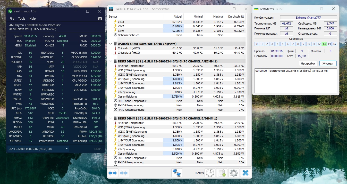 Насчёт tREFI вообще не понятно как правильно выставлять, одни рекомендуют по формуле tREFI=3.90625 x частоту памяти х 2, где то читал что надо ставить кратно 8192 или 1024, сейчас мучаю комплект F5-8000J4048G24GX2-TZ5N на частоте 7800 и с tREFI=65535 вылазит ошибка минут через 40 в анта экстрим, дело точно в этом тайминге, основные протестированы, Trfc пока вообще не трогал, сижу и думаю какое поставить, что бы потом в играх не было микрофризов, повышение напруги VDD может стабилизировать 65535?