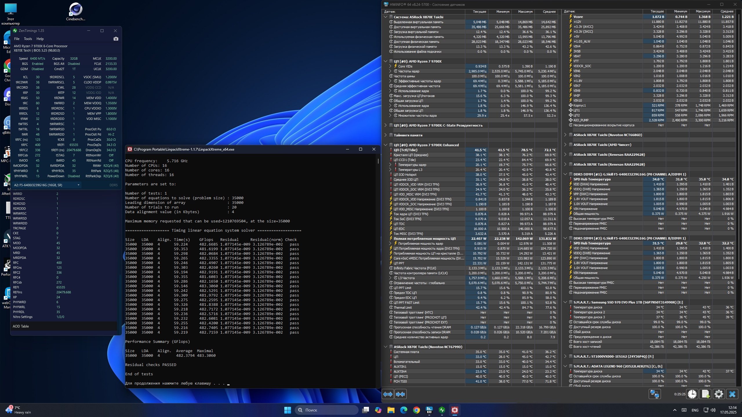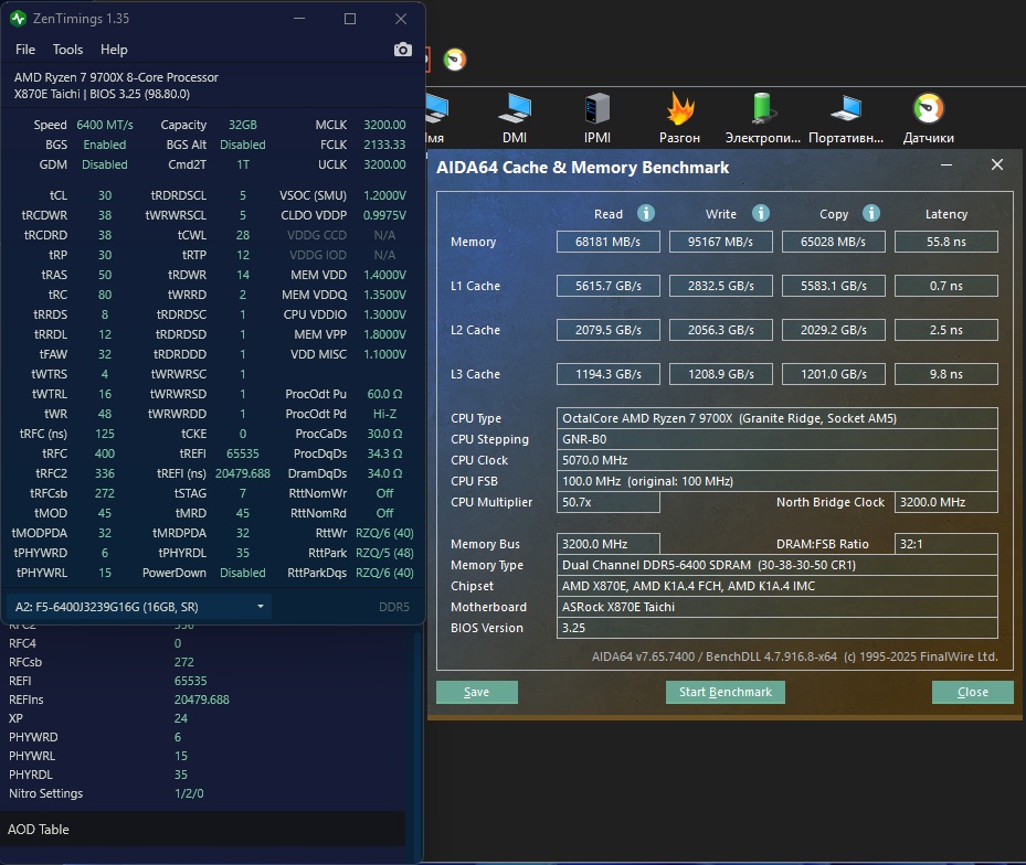 Для оптимизации задержки включена функция zen5 optimizations (в матплатах AsRock оно так называется). А также частично настройки из шапки из раздела "Оптимизация латентности в Aida64". BankSwapMode=APU Memory interleaving size=256 префетчеры не трогал, все в авто TSME=off IOMMU=off Geardown mode=off PowerDown=Disable Memory Context=Disable Spread Spectrum=off Nitro-режим 1-2-0 8х 8х Сам процессор настроен через PBO (поднят TDP до 105 вт, +200 МГц, CO -21). Фабрика 2133, VDDG оба 0.93 (0.9 маловато, чутка теряются гигафлопсы в линпаке, а с 0.95 вылезают ошибки в тестмем5). И немного тестов