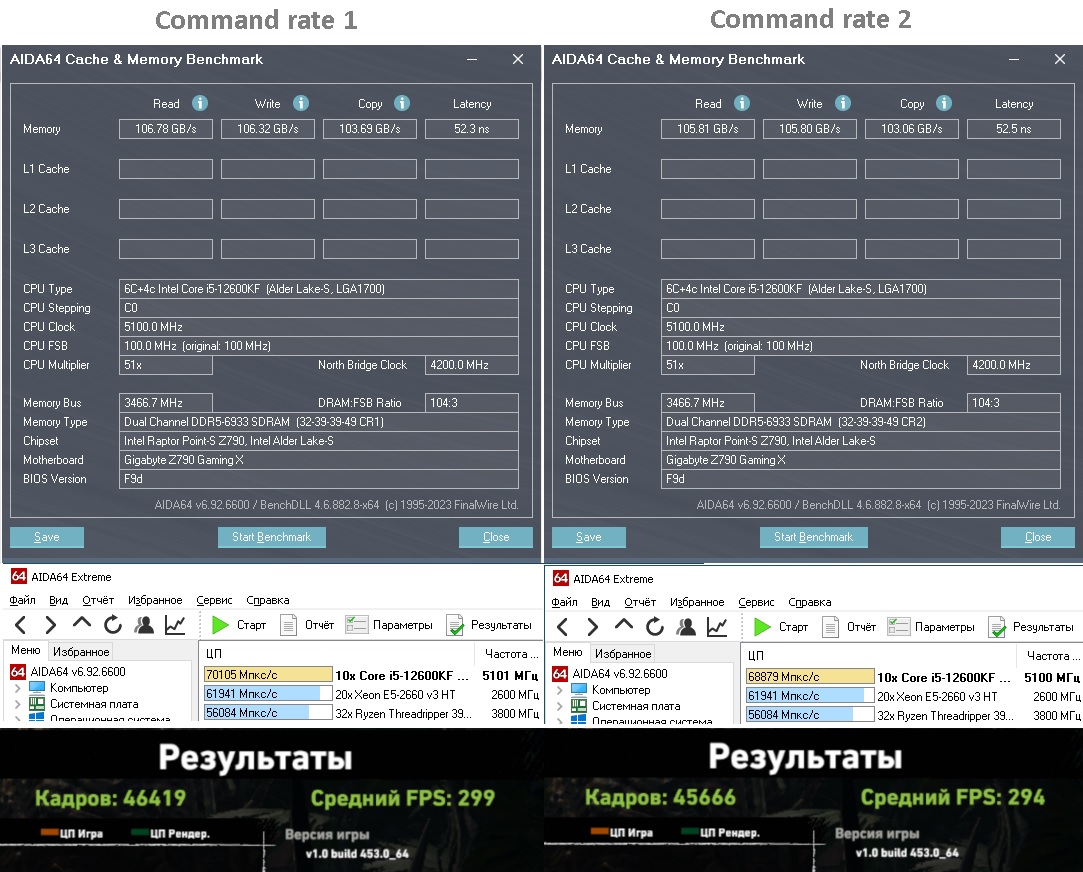 Я сравнивал со своим конфигом 7200 CR2, который мне удалось запустить, там я набил 69 352 против 70 105 на 6933 CR1, да и i9 со своей частотой способствует и пропускной способности, и уменьшению задержки. Мне на своем 12600KF например, ни на каком конфиге не удалось опуститься ниже 52 ns.