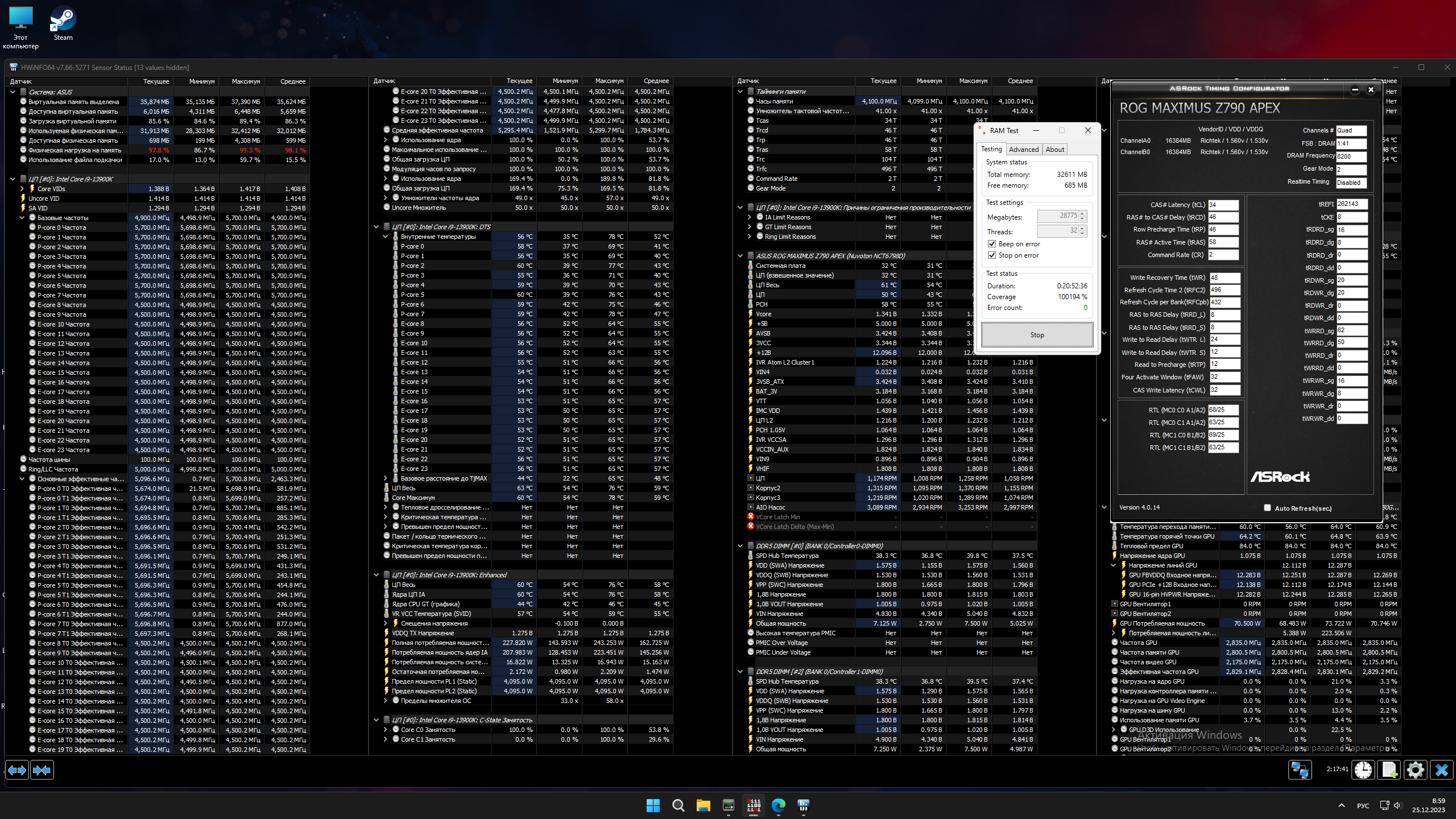 просьба знатокам взглянуть не перетянуты ли какие напряжения и пр. Разгоном с 6400 до 7000 я для 96ГБ премного доволен, trefi потом увеличу. Выстявлял VDD 1.395 (плашки 1.35), VDDQ 1.39, ТХ 1.22, КП/VDD2 1.4, первички 34-44-108 и трефи 8191 (потом увеличу). SA в авто 1.28. Час VT3+час Karhu норм. 7200 и 7400 грузятся, но ошибка после 1-2 минут этих тестов.