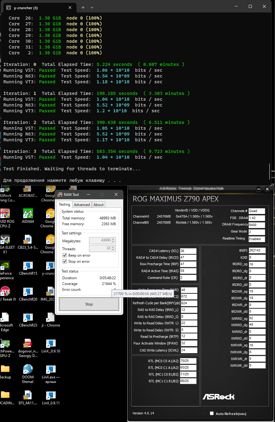 8400с36-47 на белом апексе и 13900КС с жскилловскими 8000с40 2х24 на 1.55/1.54 едут в полном стабе вообще легко, без танцев с бубнами... Но память - под водой А на OCN тебе сейчас насоветуют