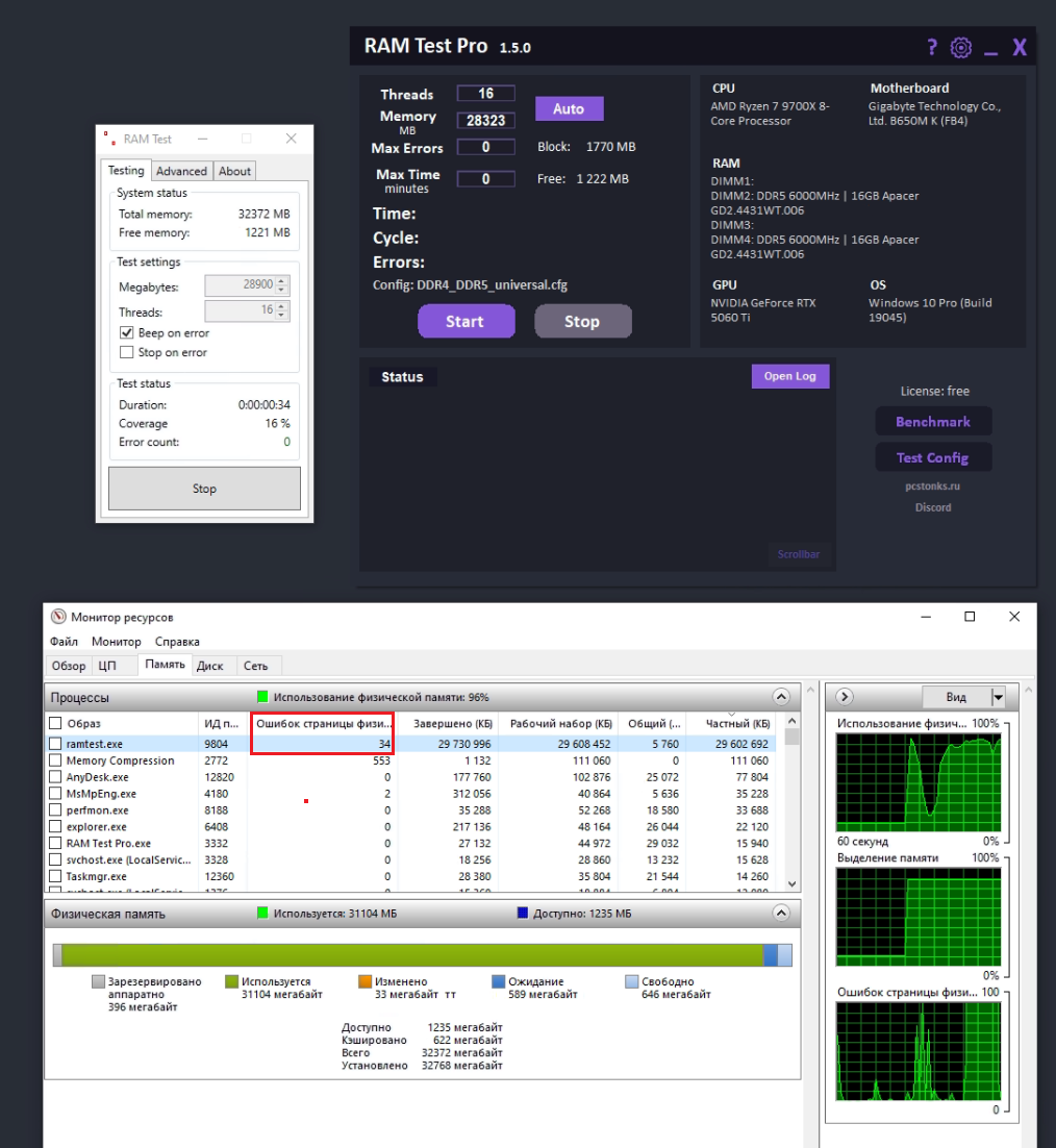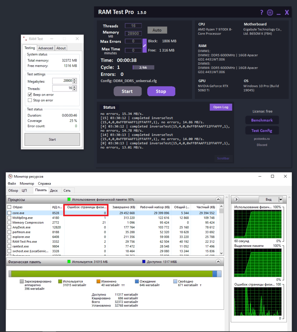 Во-первых, при аллокации физ. памяти в своп вообще лезть не надо, тест памяти не должен это делать. Во-вторых, отрезать своп от тестирования можно и это достаточно просто. И если так не написано в интернете или этого не знает чатгпт, это не значит, что это так не работает и "так будет с любым ПО". Изучите как работает управление памяти в винде, а потом уже пишите что-то публично. И в-третьих, заключающее, в кархе по какой-то причине можно выделить памяти больше, чем доступно, например 31гб при свободных 29гб, или вообще больше, чем ОЗУ всего в системе. Как думаете, почему так? Если вы так "серьезно" подошли к написанию этой части комментария, не проверяя как оно все работает на самом деле, то становится понятно, что и про "сравнение тестов" вы написали точно на таком же основании - ровно ни на каком.