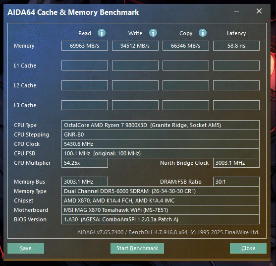 Кстати, сегодня по AIDA смог выбить задержу < 59ns. Когда брал память, думал потолок около 60ns на 9800x3d. Но, видимо, потенциал ещё раскрыт не полностью. На 6000, разумеется.