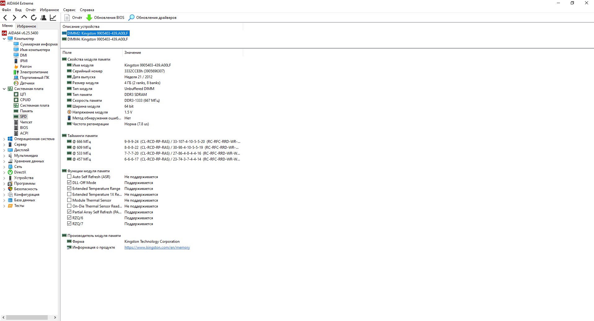3. Посмотрел, у меня модель ОЗУ Kingston KHX1600C9D3K2/8G. Получается, что память на 1600 МГц. Тогда почему в AIDA64 и других программах память отражается как 1333 Мгц? (скрин)