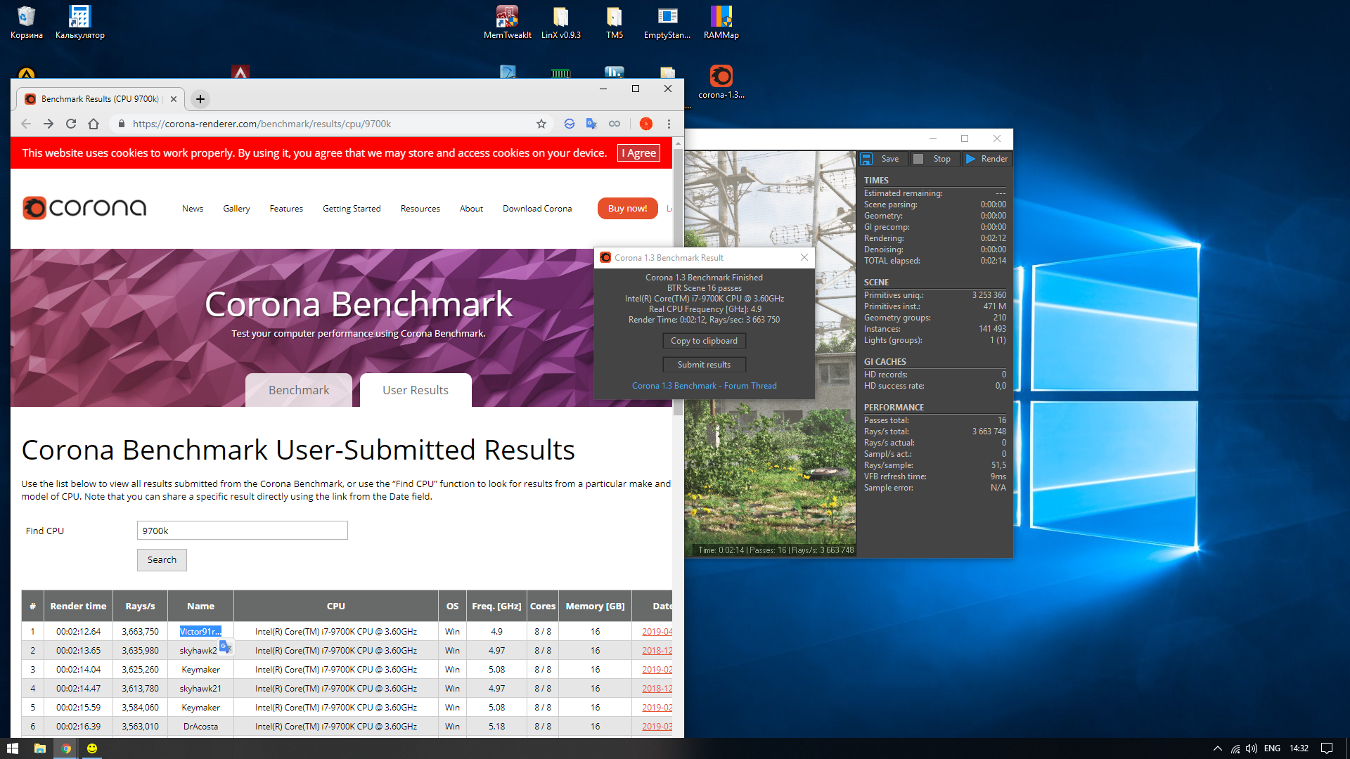 fly1ngh1gh отлично. Тут вот кстати и видно, что 8086 ака 8700к в целом мощнее,чем 9700к, но только если программа умеет утилизировать в сотку весь конвеер на всех ядрах. Увы,таких программ днем с огнем не найти