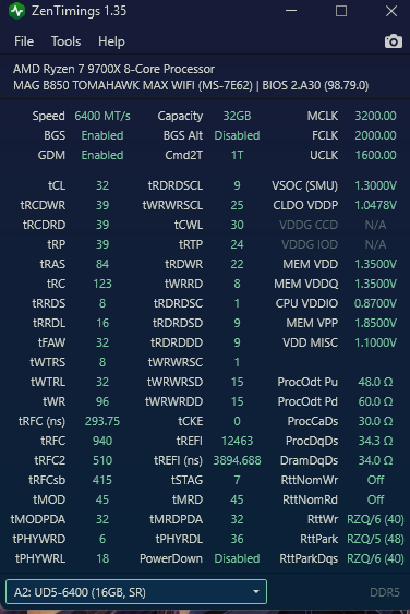 Частота 6000, тайминги 30-36-36-76. VDD=VDDQ=1.35. Остальные вольтажи если оставить в авто материнская плата сама выставит какие надо. Скорее всего VDDIO=1.35 VSOC 1.2 или 1.25