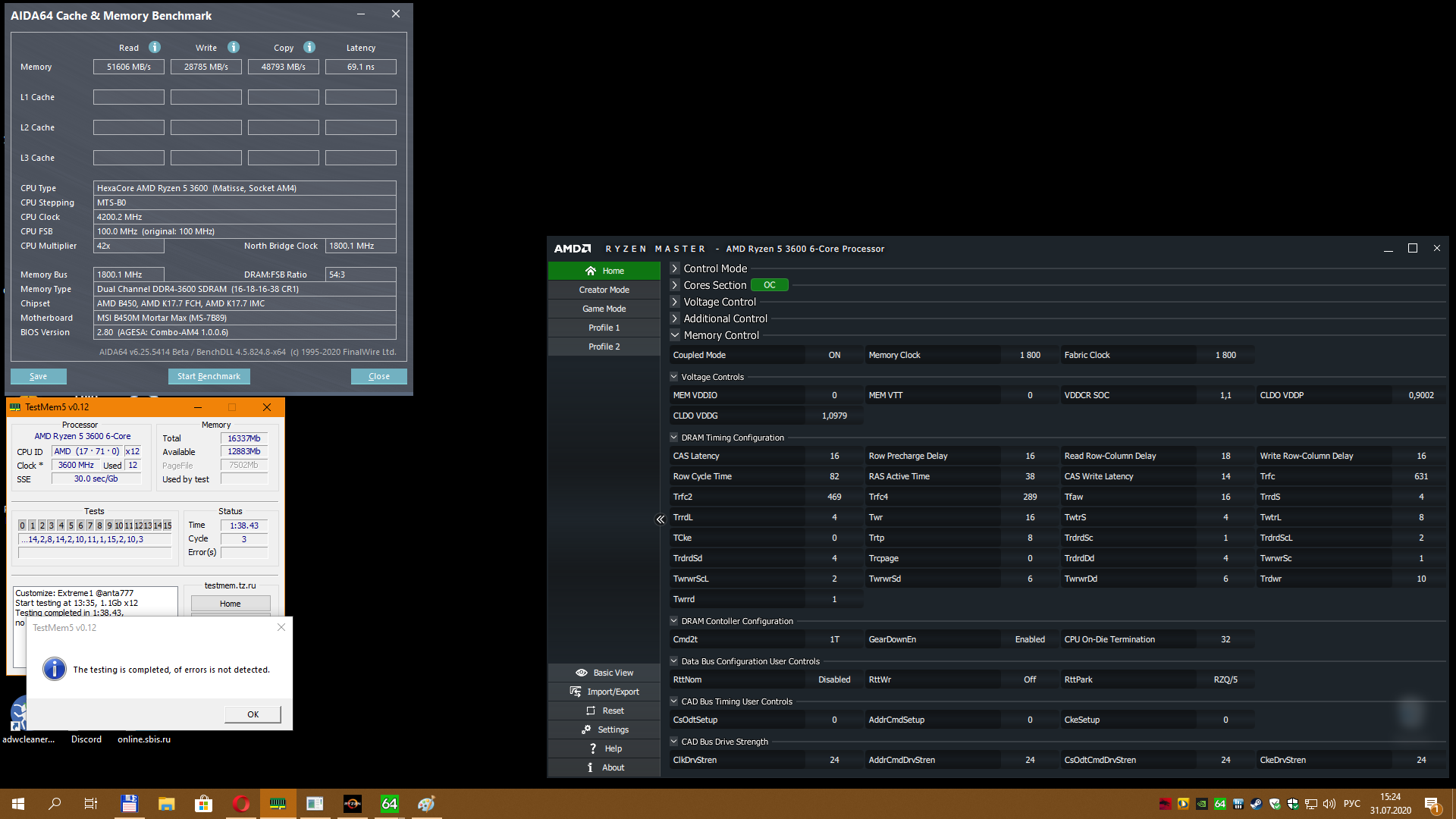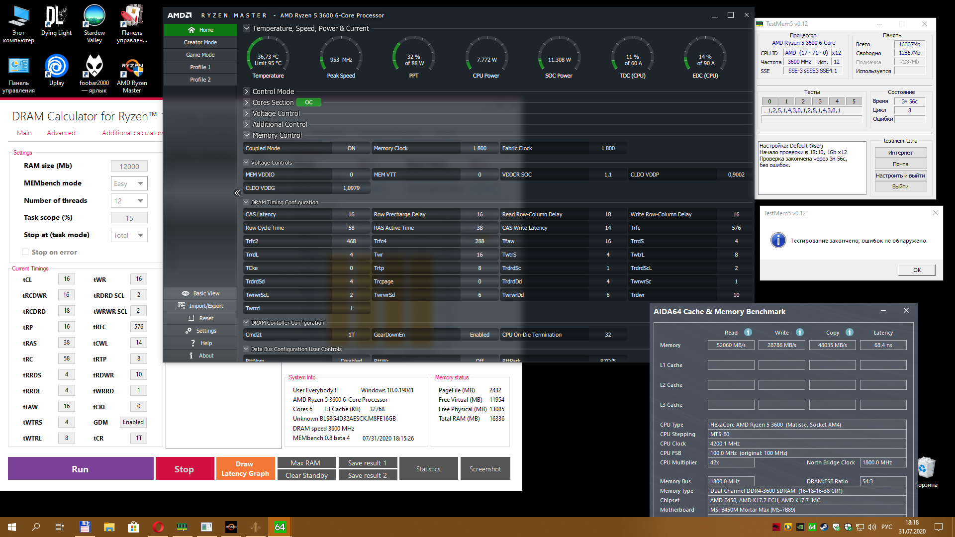 Заменил свой старый корпус, продуваемость стала получше, температуры по ощущениям стали пониже, поэтому решил наконец немного доразогнать. Имеются 2х16 Crucial BLS16G4D30AESB, сидел до этого на 3200CL16 и 1.205В. В итоге получил 3600Cl16 на 1.33В. Мне, в целом, достаточно. Тест TM5 с конфигом от 1usmus проходит.