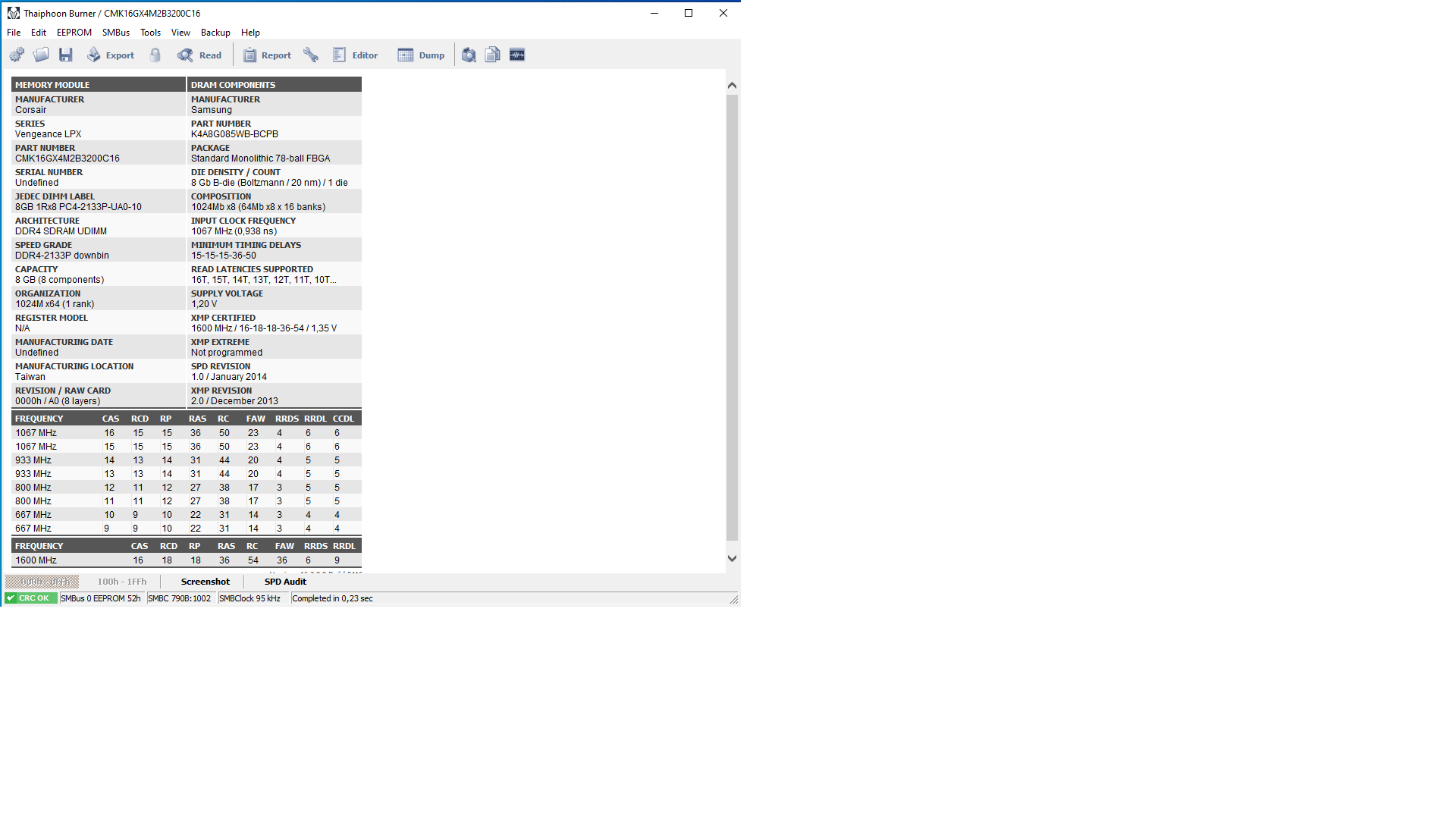 Скрин скиньте. Заочно можно сказать, что как Тайфун может ошибаться, так и чипы SEC B-die далеко не все сами по себе отборные и быстрые. А если вдруг попадутся двуранговые 16-разрядные модули 8GB SEC B-die, что вообще редкость, то про разгон можно сразу забыть.