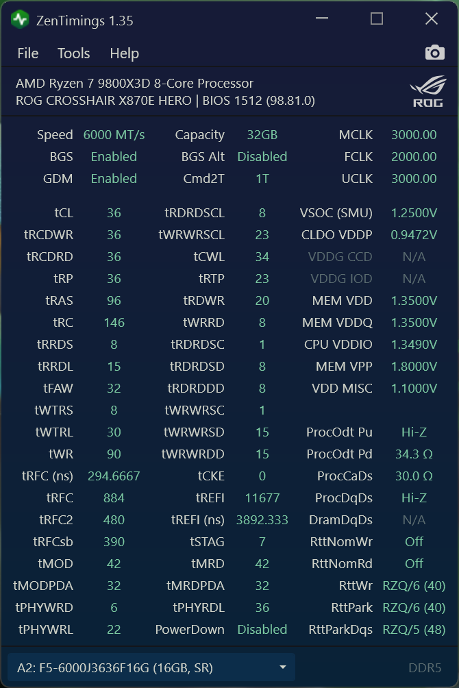 У меня такая же на чипах самсунг, настроено на 6000/30 при минимально возможном напряжении. RC уже не дожать по формуле, RFC тоже ниже не выставить. Можно настроить на 6400/32 ценой повышения напряжения и температуры на 10С. GDM off не получилось запустить ни с какими настройками/частотами. Поскольку для х3д частота памяти не так критична, планирую на днях погонять вообще на 4400.