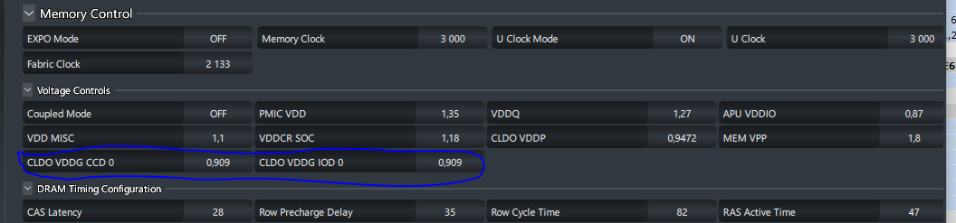 Напряжения (ориентировочные) VDDG CCD/IOD для нужной частоты FCLK (смотреть в Ryzen master) 950 mV - 2133 1000 mV - 2200 На некоторых платах в авто ставится 1.05 для любых частот выше 2000.