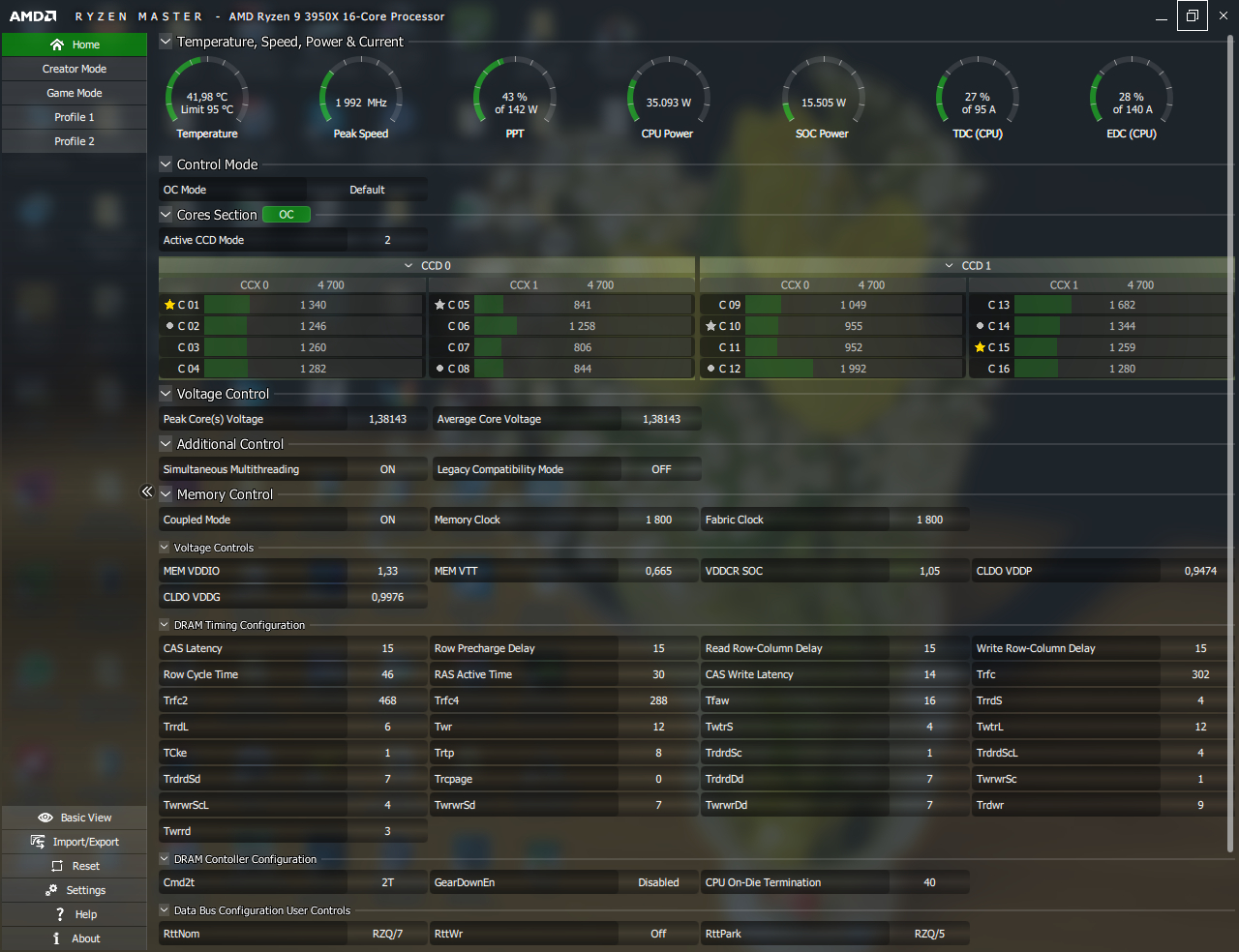 С трудом добился, чтобы память и фабрика работали на одной частоте - 1800. Память разогнал таймингами по калькулятору, тесты проходят без ошибок. Одного только не могу добиться: как только ставлю Cmd = 1T либо падает система, либо даже вообще не грузится. 2Т - без проблем.