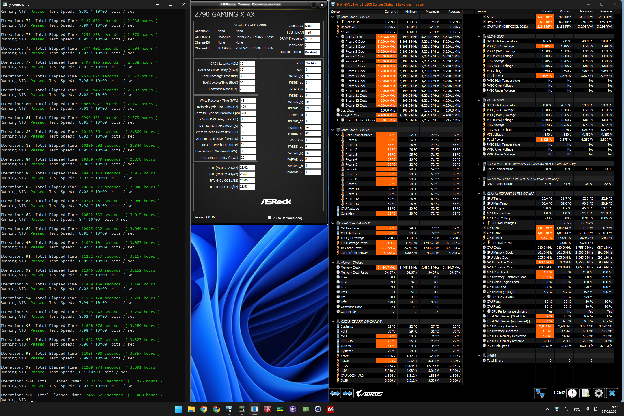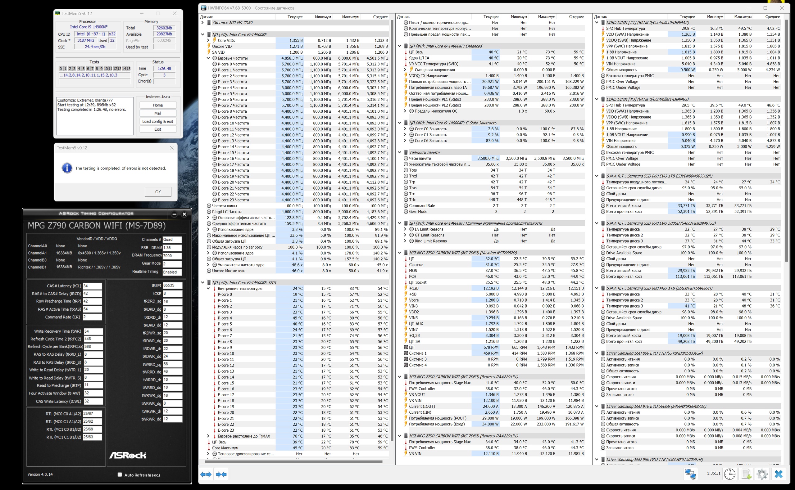 loafer аиду не смотрел. Насчёт RTP/WR ниже 12/48 - бессмысленно вообще. tRRD_S/FAW 4/16 уже проверял не раз, бес толку. У вас большой tRFC... tREFI выше не хочет? Насчёт tRDWR ниже 19 пока не могу сказать, на евге и 17 с асусом едет, но не всегда это в играх говорят даёт прирост (обычно 20 проще оставить), а то и ухудшение, не смотря на бОльшие скорости в бенчах. Я бы и 7000 сделал, но 7000 30-41 много напруги требует (около 1.53В), а 7000 32-41 не хочется. Оптимал 6800 30-39 выбрал. Кстати, какие у Вас напряжения? У меня выше указаны. CR=1 едет на 12Gen. Intel, на 13 Gen. не запускается насколько помню.