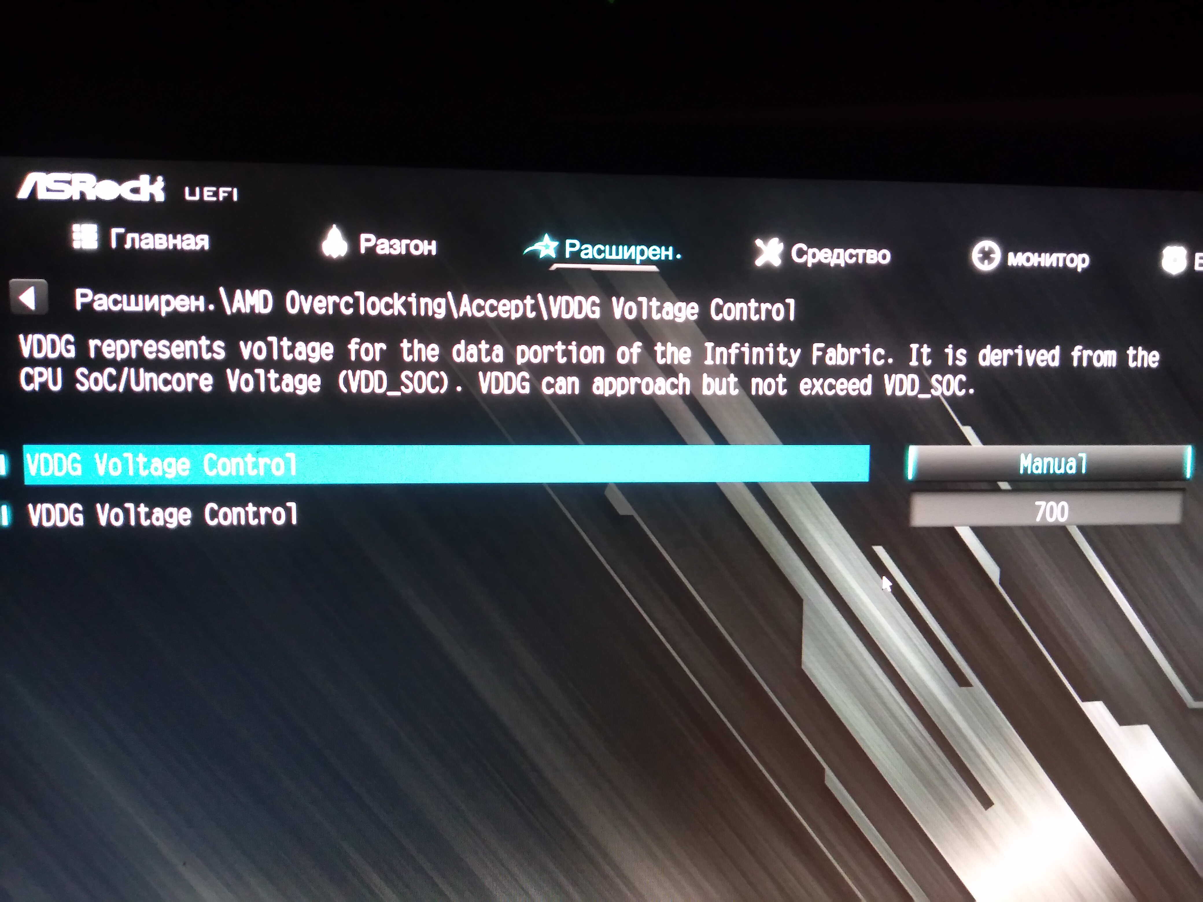 Раздел AMD Overclock - это то, что выводит, редактирует Ryzen Master. По сути его можно снести и использовать биос. VDDG позволяет редактировать напряжение на память более тонко, если мать не позволяет это делать сама. У меня шаг 0.05. А мне надо меньше. Я DRAM V ставлю 1.45, а VDDG ставлю меньше, сколько нужно. VDDG не может быть выше DRAM V, но может быть меньше или равен. Там в описании все написано. Учи англ. язык, пригодится.