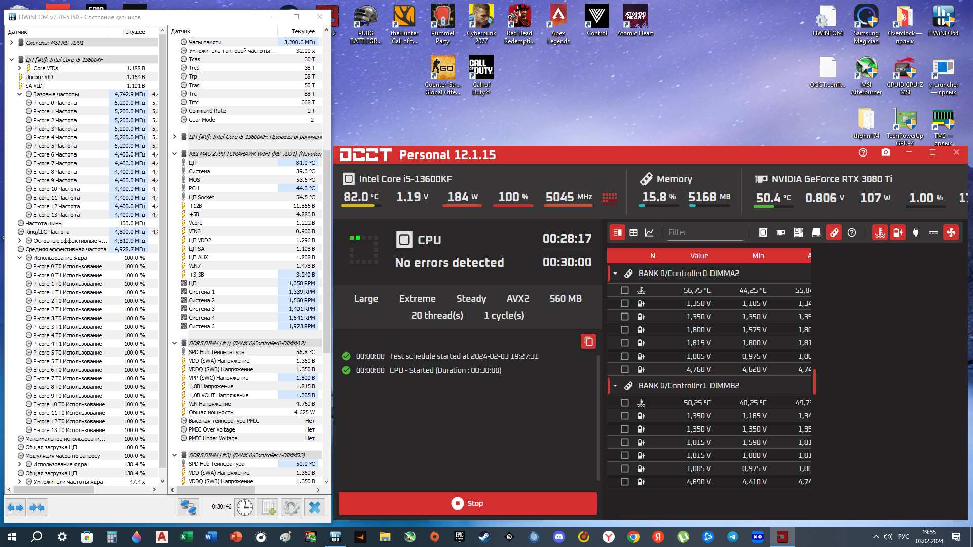 Доброй ночи форумчане) Хочу поделиться небольшой статистикой и инфой, может кому будет полезно) Прошу не судить строго, 5ое поколение ещё не гонял Обновил на днях старенькую сборку (9900kf@5Ггц, Crucial Ваllistix Micron E-dae @4000Мгц 16-20-19-38) на вот такой билд: i5-13600kf MSI MAG Z790 TOMAHAWK WIFI Patriot Viper Venom [PVV532G740C36K] 32 ГБ Брал эти плашки именно под разгон (не рекордный, если что). То что в хмр могут не поехать был осведомлён конечно) Спойлер - не поехали ни один из 3шт(7000, 7200, 7400). Точнее завелись, но стабильностью там и не пахло, от слова совсем) Покурив форумы, видево, мануалы и т.д. по данному вопросу приступил к делу. Расчёт был на 6800Мгц с адекватными таймингами, так как априори предполагалось (не только мной, но и некоторыми блогерами) что на 7400 Патриотах уж точно Хуниксы А-дае, не иначе! Ноооо не тут то было))) Потратив пару дней и испробовав несколько десятков (а может и под соточку ) сочетаний вольтажей, выяснилось, что потолок таки в этом сетапе это 6400Мгц При любых сочетаниях вольтажей (от сверх низких до предельных) при начале тестирования кранчем или ТМ5 моментально сыпали ошибки) И что показательно на 6400 вольтажи (как и тайминги) получилось весьма прилично понизить и стабилизировать память) Так же надо заметить, что тайфун плашки полностью не читает, а дата производства 34 неделя 2023г. Из выше сказанного могу предположить (не утверждаю), что чипы таки M-dae В связи с чем возникает резонный вопрос к Пэтриот..... какого хрена они делают в планках на 7400? ))) Не исключаю конечно, что проблема в контроллере конкретного проца, или косяки в биосе MSI.