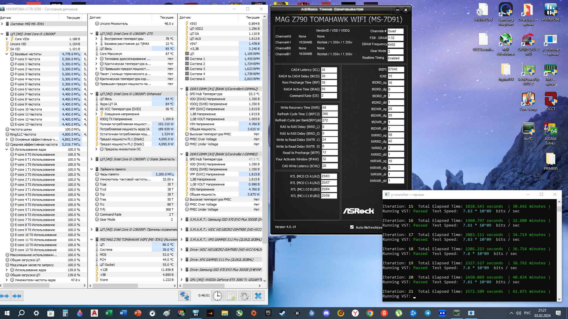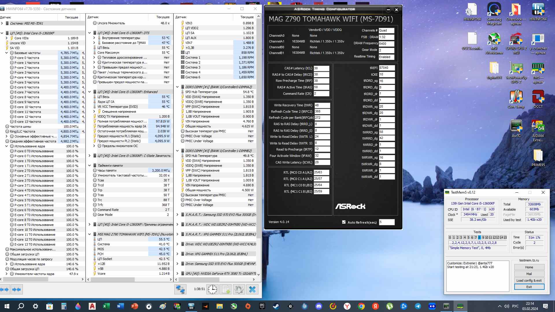 Msi Carbon Z790 + F5-7800J3646H16GX2-TZ5RK Вроде бы стабильность на 7400 удалось выжать, тест ТM5 с конфигом Anta за час без ошибок. Есть ощущение что еще что-то можно поднастроить)