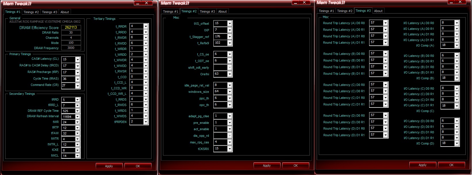 Разгон памяти у современной DDR4 (16 банков,RRDS=4,FAW=16,BL=8) эффективен только при tRC<=64,если каждый новый блок чтения происходит с разных банков памяти. Для 4-х слотовых плат при разгоне желательно в биосе отключить неиспользуемые слоты. Для максимальной производительности памяти значение tRFC в тактах для 8-Гбитных чипов должно быть кратно 8,а для 16-Гбитных чипов - 16. Если это правило не соблюдать, то будут вставлены лишние такты при каждом цикле обновления памяти. Для желающих максимально снизить tRFC. Делим tRFC на сумму tRCD,tRTP и tRP. Если результат ближе к 4, то снижать tRFC можно по 4 такта. Если результат ближе к 2, то снижать tRFC можно по 2 такта. Это связано с тем, что обновление происходит субмассивами, которые обязательно кратны 2.