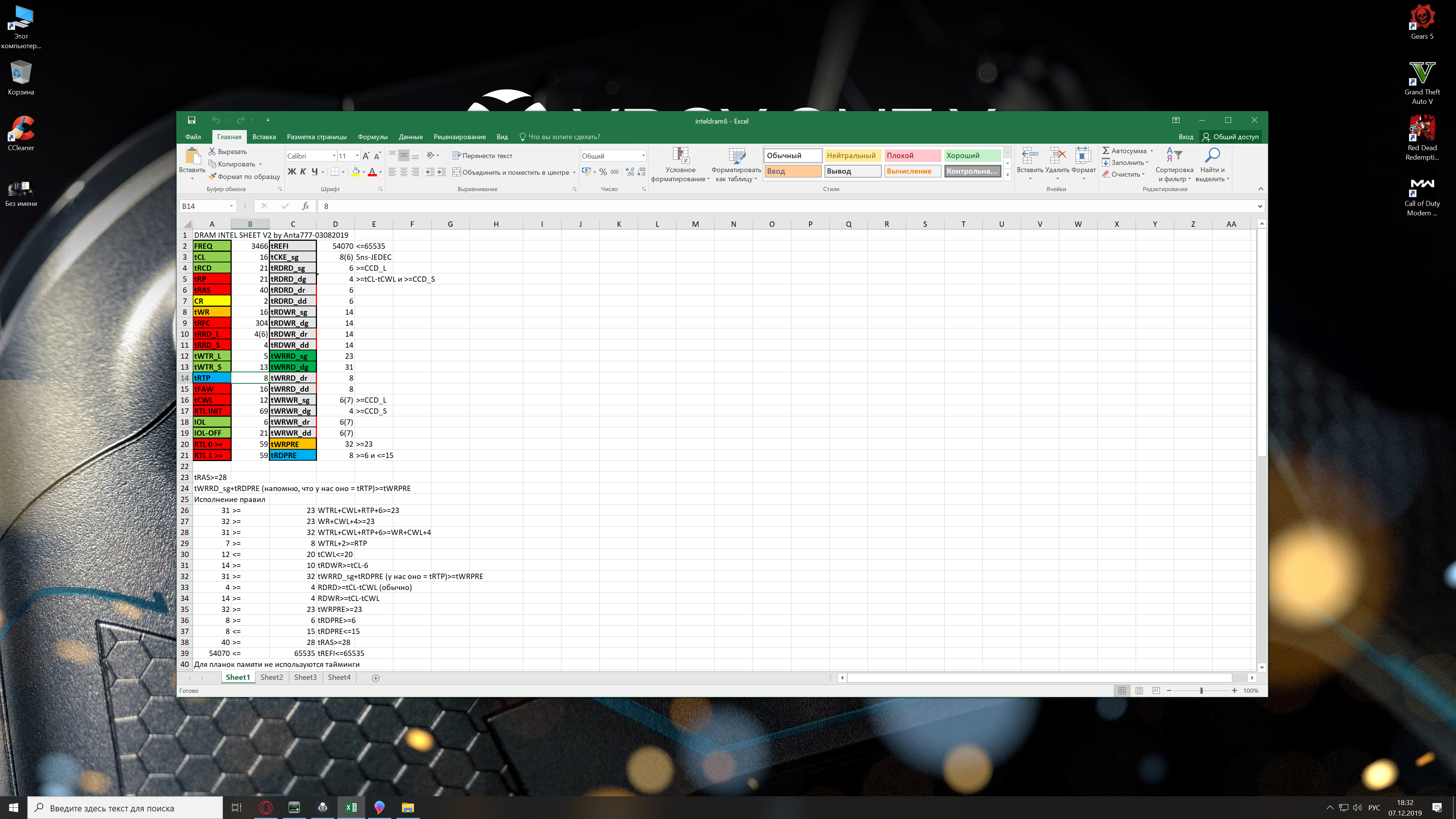 Здраствуйте уважаемые форумчане! Помогите пожалуйста настроить память! Память на сколько я правильно понимаю не очень чипы E-de Kingston! 2*8 одноранг XMP профиль 2933мг.! Прочитал страниц 200 этой темы и по таблице разогнал память до 3466 вроде стабильно! Напряжение на память 1.35