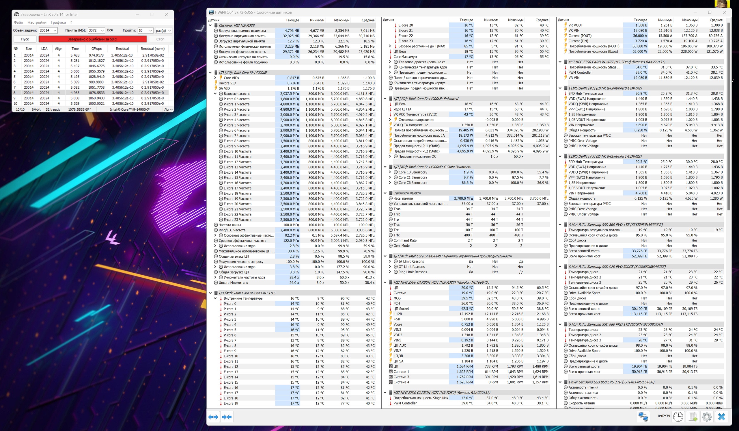 Я сейчас Linx'ом тестирую. Очень расстроен своим VDDQ TX... Купил i9 14900K, на 6400 MHz нужно 1.35-1.4V, на предыдущем i7 13700KF нужно было 1.17V, вот сижу ищу стабильность, хотя TestMem5 проходил Extreeme пресет, а Linx даже на 30000 объеме задачи находит ошибку спустя 1 минуту