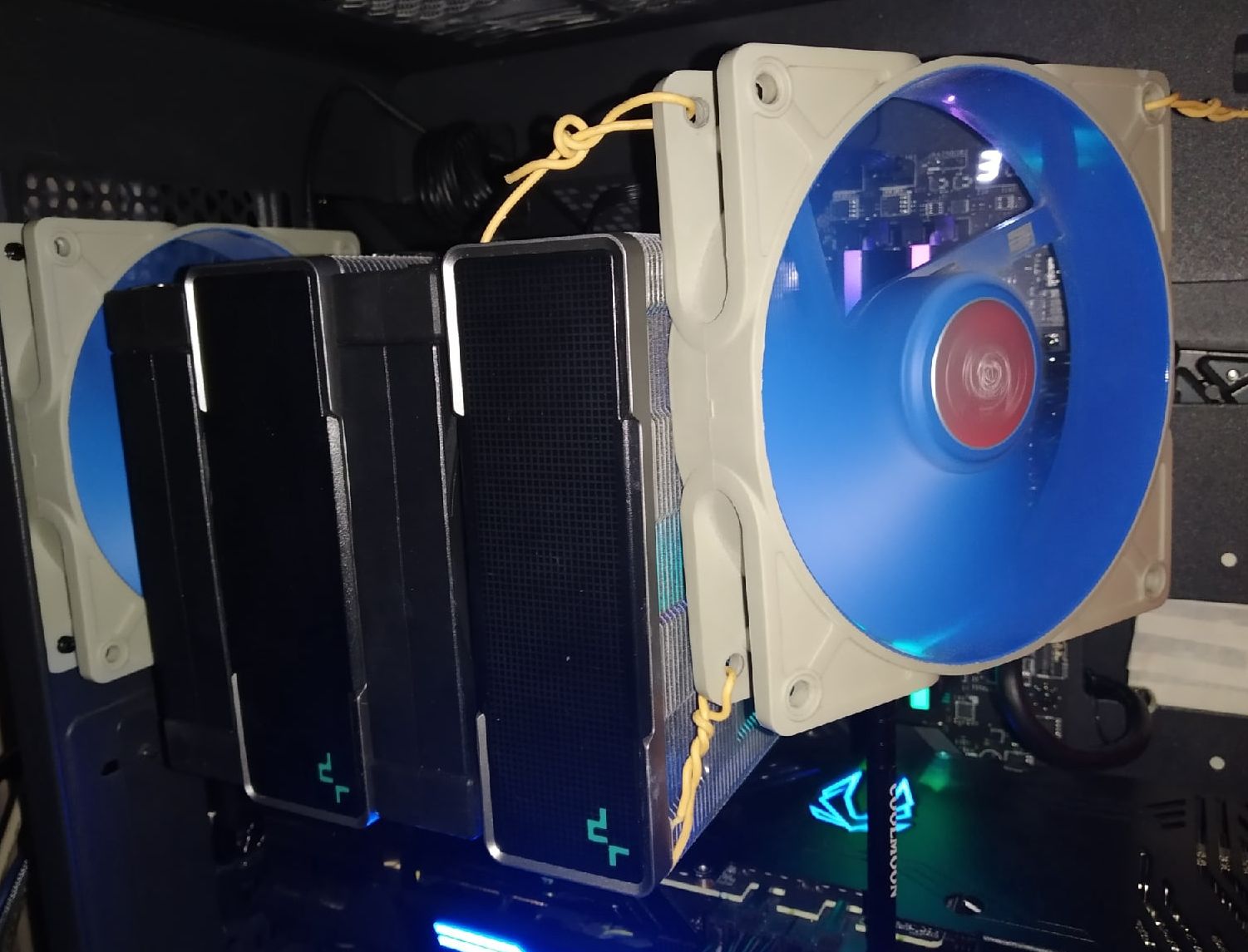Ну вот думал - под кулером вдоль планок. А вентилятор кулера выше планок прямо над ними - ему мешать не должно, вроде. Взять 40х40 и поставить прям в упор к планкам с торца, где зажимы - вот он как раз между планками дуть и будет, не вклиниваясь в поток кулера? Потому как планки стоят все равно поперек потока кулера, так что в этом месте движения воздуха поперек планок все равно нет. Хотя, хрен знает, какие там в итоге завихрения могут получиться. Надо попробовать... Как вам идея? Покритикуйте?