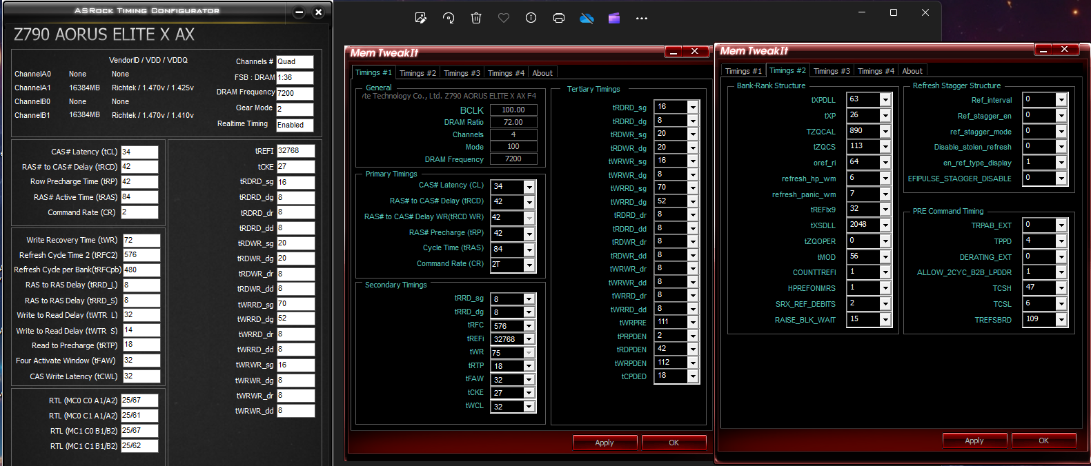 Всех приветствую. Далёк от тонкого разгона. Имеется 14700kf, MSI MAG Z790 TOMAHAWK WIFI, G.SKILL Trident Z5 RGB Series DDR5 7200 (PC5 57600) DIMM 288 pin, 16 ГБ 2 шт. 1.4 В, CL 34, F5-7200J3445G16GX2-TZ5RK. Биос последний. у памяти XMP 1 на 7200, при его установке, не проходят тесты, из прочитанного понял что надо руками дописать, пробовал, не получается, нет стабильности. Память работает стабильно начина с 6800 и ниже. Почитал шапку, в общем понятно, но чем глубже, тем больше запутался.)) Так всё таки, это проблема MSI, памяти, или всё же надо что-го точнее прописывать в биосе?