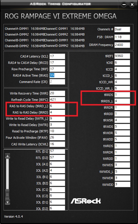 Начните с RCD, CL. Не обязательно должны быть одинаковыми, обычно CL идёт меньше чем RCD. RAS сразу пробуйте как RCD+CL+4, до этого значения от него существенная разница, дальше меньше. CWL<=CL. Допустимые значения 9,10,11,12,14,16,18,20. RP можете выставить по RCD, если пойдёт меньше - тоже неплохо, не уверен правда насчёт смысла. RTP без формул. Если не идёт вниз можно попробовать поднять чуть чуть RP. В DDR4 явно связан с WR соотношением 2 к 1 (например WR20\RTP10), физически хранится одно значения и в зависимости от операции интерпретируется. Скрутите FAW до 16(так и оставьте если работает). С таким FAW скручивайте RRD(оба, L обычно больше чем S), возможно поедут на 4 оба. Если до 4 не удалось спустить поднимите FAW до уровня RRDL*4 и попробуйте ещё, хотя это скорее всего уже почти предел. Обычно L>=S. L - SG(Same Group). S - DG(Different Group) Напр. RRD_L>=RRD_S. CKE=5 СCDL>=4 RDRD_DD и прочие подобные можно проигнорировать если у вас нет двух планок на один канал (4 планки). DD-Different Dimm. Тоже самое с DR-Different Rank если у вас одноранговая память. RDWR_SG(DG) и подобные сочетания скручивайте до минимальных рабочих, потом накиньте сверху +2. Как уже отметил обычно SG>=DG. WTR не трогайте он сам спустится когда будете скидывать WRRD_SG(DG) и прочие подобные. Если сам меньше не стал тогда руками скидывать. WR снижать через WRPRE если есть. Если нет или не снижает WR, То скрутите его скажем до 12 или +4 от рабочего, потом дожмёте если не лень будет. RFC явных формул нет, крутить после всего списка сверху. Не пытайтесь найти его минимальное значение если не хотите чтобы память начинала сыпать ошибками от любого чиха. найдите пограничное со стабильностью значение и накиньте сверху 20 или сразу 40. Может реагировать на RAS+RP, RRD, FAW, причём в обе стороны (то есть может "сломаться" если задрать названные), а может и не реагировать... REFi больше лучше. Связан с RFC. REFI сколько память "работает" - RFC сколько "отдыхает". Оба тайминга лучше не пытаться найти предельное значение.Заметно реагируют на температуру. Многие тайминги отзываются и на температуру и на напряжение. Поскольку напряжение может как позволить снизить тайминг, так и увеличить температуру, то середину можно искать очень долго, поэтому лучше бы вовремя остановится. Тестируйте тщательно с перезагрузками, сном, холодным стартом. RTL и IOL вам кто-то другой пусть советует как настраивать, от них у меня голова болеть начинает...