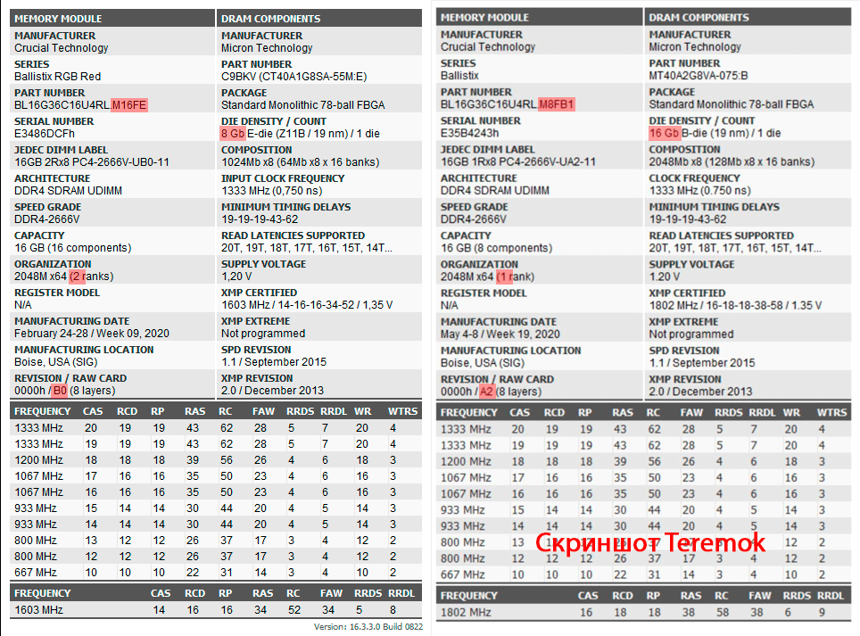 Как видишь, один идёт на Micron E-die 8 Гбит, двухранговый, второй - на Micron B-die 16 Гбит, одноранговый. У теремка модули на B-die, а не на E-die, как ты впариваешь. Не бывает печатных плат для двухранговых модулей с PCB типа A (A0/A1/A2), они все типа B. Тебе подсказка была дана на скриншоте теремка, алло, юноша? Смотрю в книгу, а вижу...? Так кто из нас дилетант?