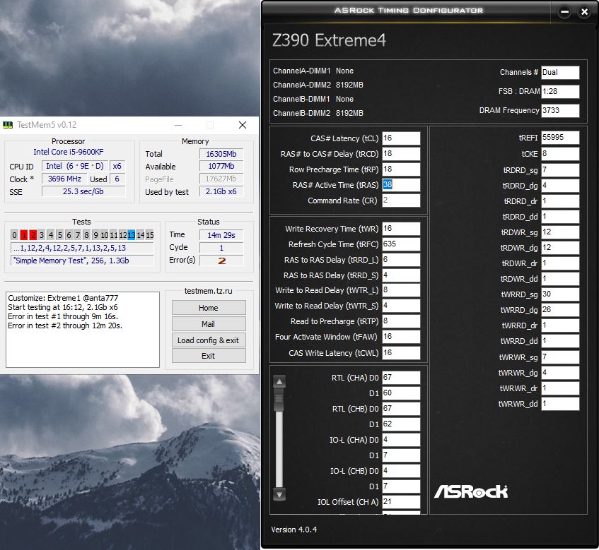 Настраивал при VDram 1.42, IO 1.25, SA 1.3 (по мониторингу везде +0.02) Снижение любого из таймингов tRFC/tRRD_L/tRDWRsg/dg и увеличение tREFI свыше 58000 приводило к ошибкам в Extreme тесте, поэтому остановился на тех значениях что указаны на скриншоте, с ними проходит тест без ошибок и на сниженном до VDram 1.4 io 1.13 sa 1.2 вольтаже. Изменение dr/dg, несмотря на то что память одноранг, так же пагубно влияет на стабильность.