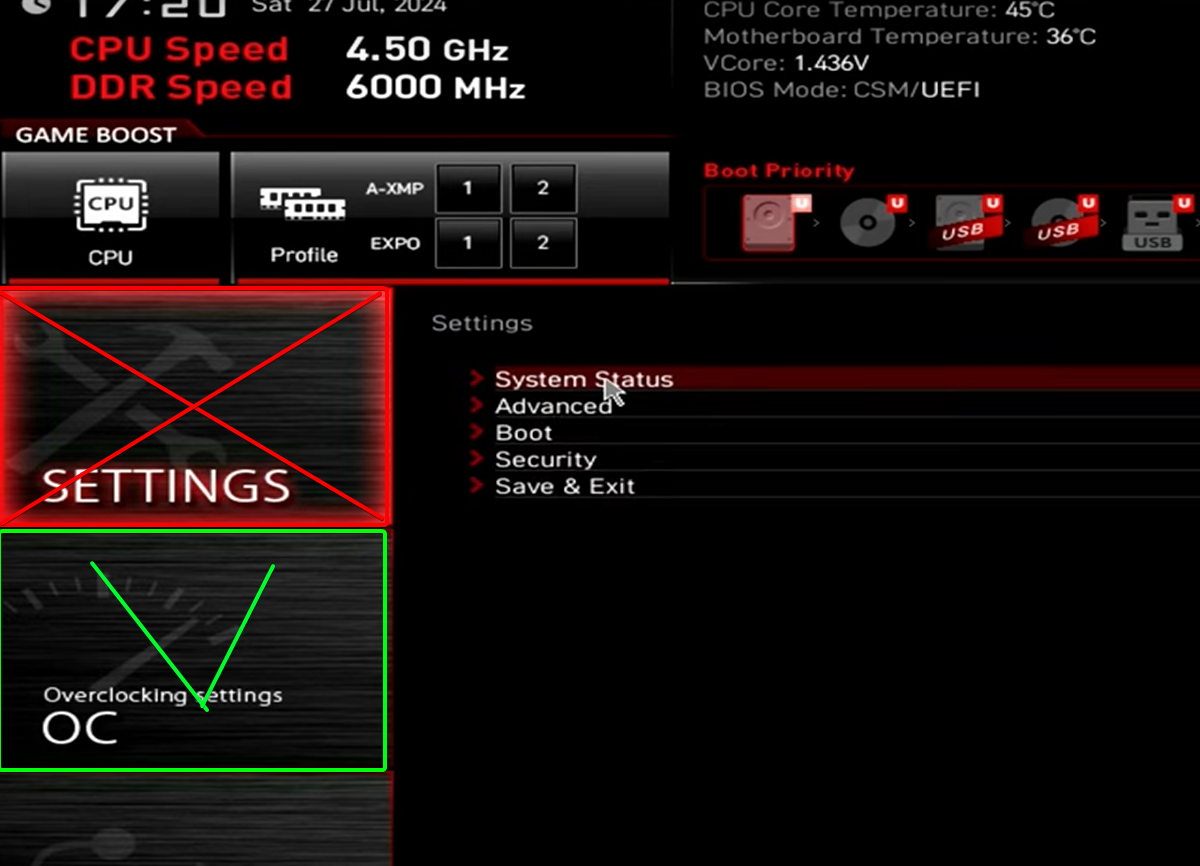 В общем, ситуация в следующем. В биосе msi x670e gaming wifi невозможно изменить тайминги и напряжение. Профили xmp и expo отключены, сброс до заводских настроек не помог, биос прошивал и перепрошил ещё раз при заводских настройках - всё без толку.
