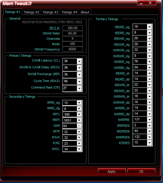 Приветствую господа, я так понимаю, 4 плашки выше 6000 уже не поедут? Стартуют до 6600, но никакими напряжениями не держат стабильно, любая цифра выше 5800 в итоге приводит к синему экрану или ребуту. Настроил, что называется, "как смог", подскажите пжл, что еще можно по таймингам ужать, раз уж частота не идет выше? #77