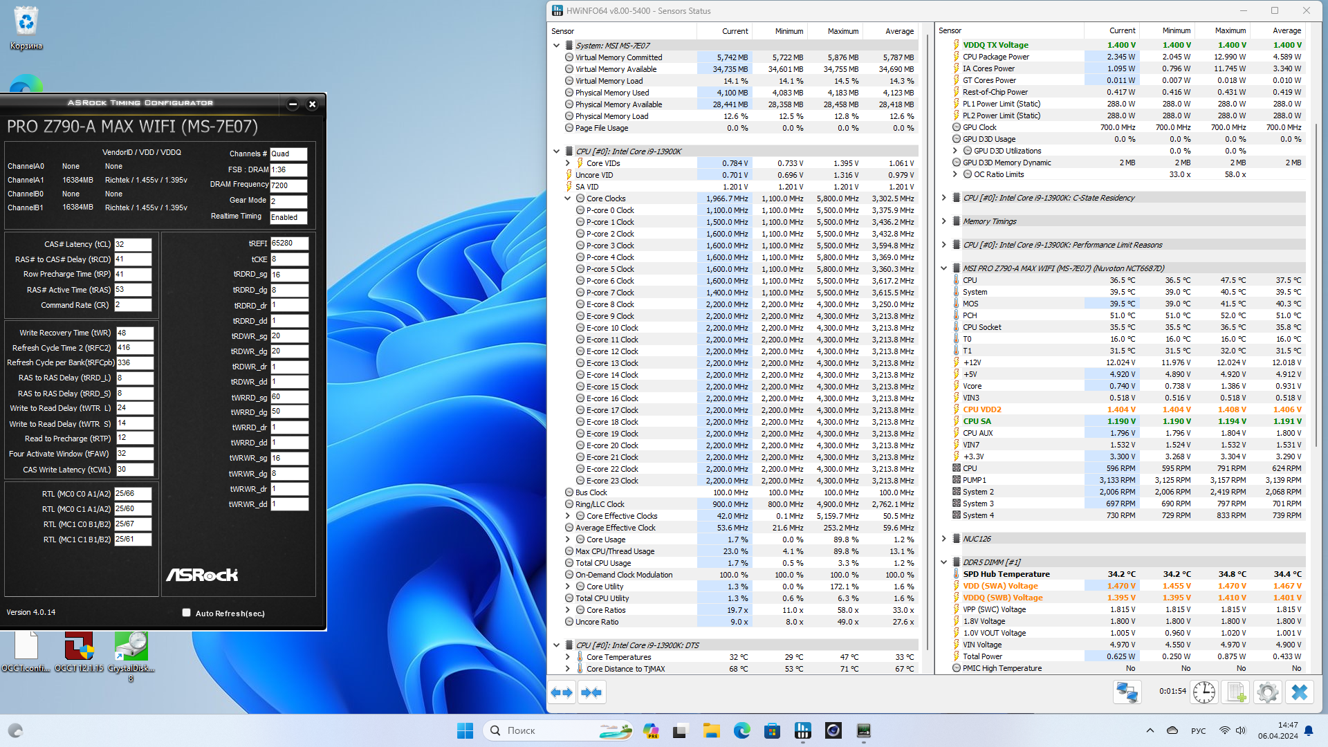 Ищу подсказки от экспертов в разгоне DDR5. Материнка z790 aorus elite x wifi7. Заметил странную штуку. На процессоре i5 12600kf, память разогнал до 7400 cl 34, SA 1.25v, cpu tx 1.3v, cpu vdd2 1.4v, ram vdd 1.5v, ram vdd2 1.5v, все работало стабильно, хорошо, анта экстрим не один раз на фул проходил, кранчер 50-60кругов не раз запускал все ок, потом Приехал процессор i5 14600kf запускаю старый профиль и афигел, он даже винду не грузил, я испугался, начал крутить, в итоге накрутил до 7600 cl 34, SA 1.15v, cpu tx 1.3v, cpu vdd2 1.4v, ram vdd 1.47v, ram vdd2 1.44v, теперь работает стабильно и хорошо. Но почему после смены процессора вообще нивкакую не хотело на старых напряжениях? Дальше я купил ещё 1 кит 6400, и 2 6800, третий кит на 6800 пока в дороге, все они на чипах hynix a-die. Начал пробовать запустить на 7800 cl 36 или 38, SA 1.15v, cpu tx 1.3v, cpu vdd2 1.4v, ram vdd 1.5v, ram vdd2 1.45v, игрался с напряжениями. Тестил пока ток в TM5, на моей 6800 на 4 минуте ошибка, на 6400 на 12 минуте, первой 6800 что приехала на 1 минуте ошибки сыпит, вторую 6800 пока не успел по тестить. Меня интересует вопрос, у меня контроллер проца не вывозит 7800 или дело в подборе напряжений, или в самых китах памяти?