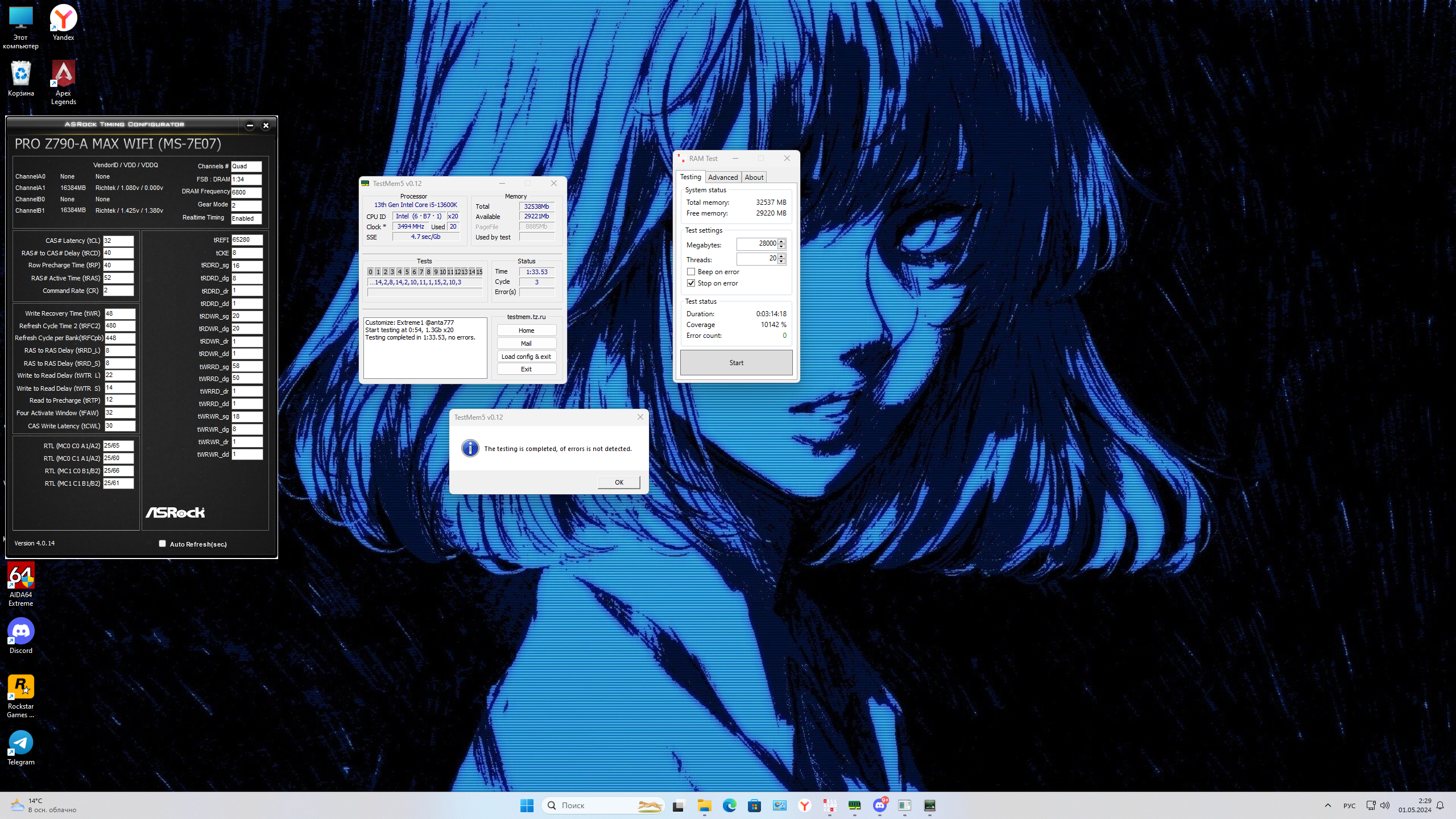 Ищу подсказки от экспертов в разгоне DDR5. Материнка z790 aorus elite x wifi7. Заметил странную штуку. На процессоре i5 12600kf, память разогнал до 7400 cl 34, SA 1.25v, cpu tx 1.3v, cpu vdd2 1.4v, ram vdd 1.5v, ram vdd2 1.5v, все работало стабильно, хорошо, анта экстрим не один раз на фул проходил, кранчер 50-60кругов не раз запускал все ок, потом Приехал процессор i5 14600kf запускаю старый профиль и афигел, он даже винду не грузил, я испугался, начал крутить, в итоге накрутил до 7600 cl 34, SA 1.15v, cpu tx 1.3v, cpu vdd2 1.4v, ram vdd 1.47v, ram vdd2 1.44v, теперь работает стабильно и хорошо. Но почему после смены процессора вообще нивкакую не хотело на старых напряжениях? Дальше я купил ещё 1 кит 6400, и 2 6800, третий кит на 6800 пока в дороге, все они на чипах hynix a-die. Начал пробовать запустить на 7800 cl 36 или 38, SA 1.15v, cpu tx 1.3v, cpu vdd2 1.4v, ram vdd 1.5v, ram vdd2 1.45v, игрался с напряжениями. Тестил пока ток в TM5, на моей 6800 на 4 минуте ошибка, на 6400 на 12 минуте, первой 6800 что приехала на 1 минуте ошибки сыпит, вторую 6800 пока не успел по тестить. Меня интересует вопрос, у меня контроллер проца не вывозит 7800 или дело в подборе напряжений, или в самых китах памяти?