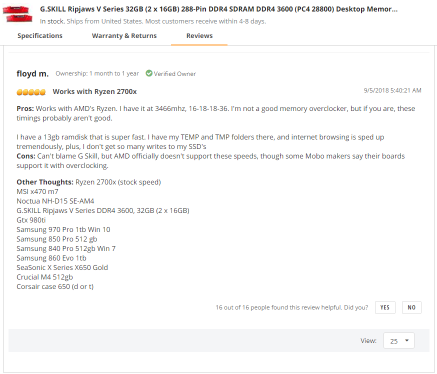 Здравствуйте всем. В ближайшее время планирую приобретать мат плату MSI X470 Gaming M7 AС, и хочу приобрести ОЗУ для нее, 32 Гб. Пока хочу брать такую память - https://www.newegg.com/Product/Product. ... 6820232736 помню раньше говорили, что двухранговая память лучше показывает себя на Ryzen, хотя и гонится хуже, но в итоге латенси все равно ниже, чем на одноранговой. Если мой выбор плох, если память на Newegg получше, под разгон? Хочу не меньше 3600 Мгц, а лучше больше, не важно одноранг, двухранг(если двухранг хватит 3466, наверно) и не менее 32 Гб. Ограничение по финансам 16к. Можно память и на https://www.computeruniverse.ru/list.as ... navigate=3 взять, если там есть варианты получше. Особенно интересует совет товарища 1usmus, судя по ветке выбора матери и ОЗУ мастер разгона ОЗУ. Заранее спасибо.