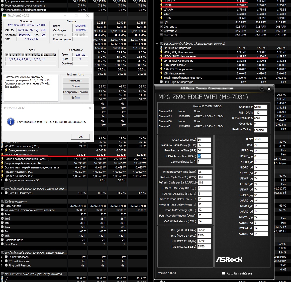 У меня была MSI Z690-A Pro DDR4 , нашёл скрины - и да, там тоже такое было. 3990 вместо 4000 и 3857 вместо 3866. Возможно с тактовым генератором связано, ты прав. Мне правда казалось, на каком-то инженерном биосы были цифры ровные, но я мог и попутать Насчёт ASUS TUF не уверен, есть скрин со Strix Z690, там всё в порядке (кроме кривого tWR, считают проги по разным формулам, это есть в шапке): Да, на Z690 Aorus Master все ровно: 6200 это 6200. Тока вот даже с топовыми плашками выше 6400-2Т я пока не ушёл Что-то всё же платы пережимают, или с напряжениями козлят. Случаются ошибки на ровном месте, вчера в 6400-1Т 32-39-39-51 открутил 15-20 минут теста и оп, пара ошибок. Модули под обдувом, выше 48 градусов по датчику не поднимались.
