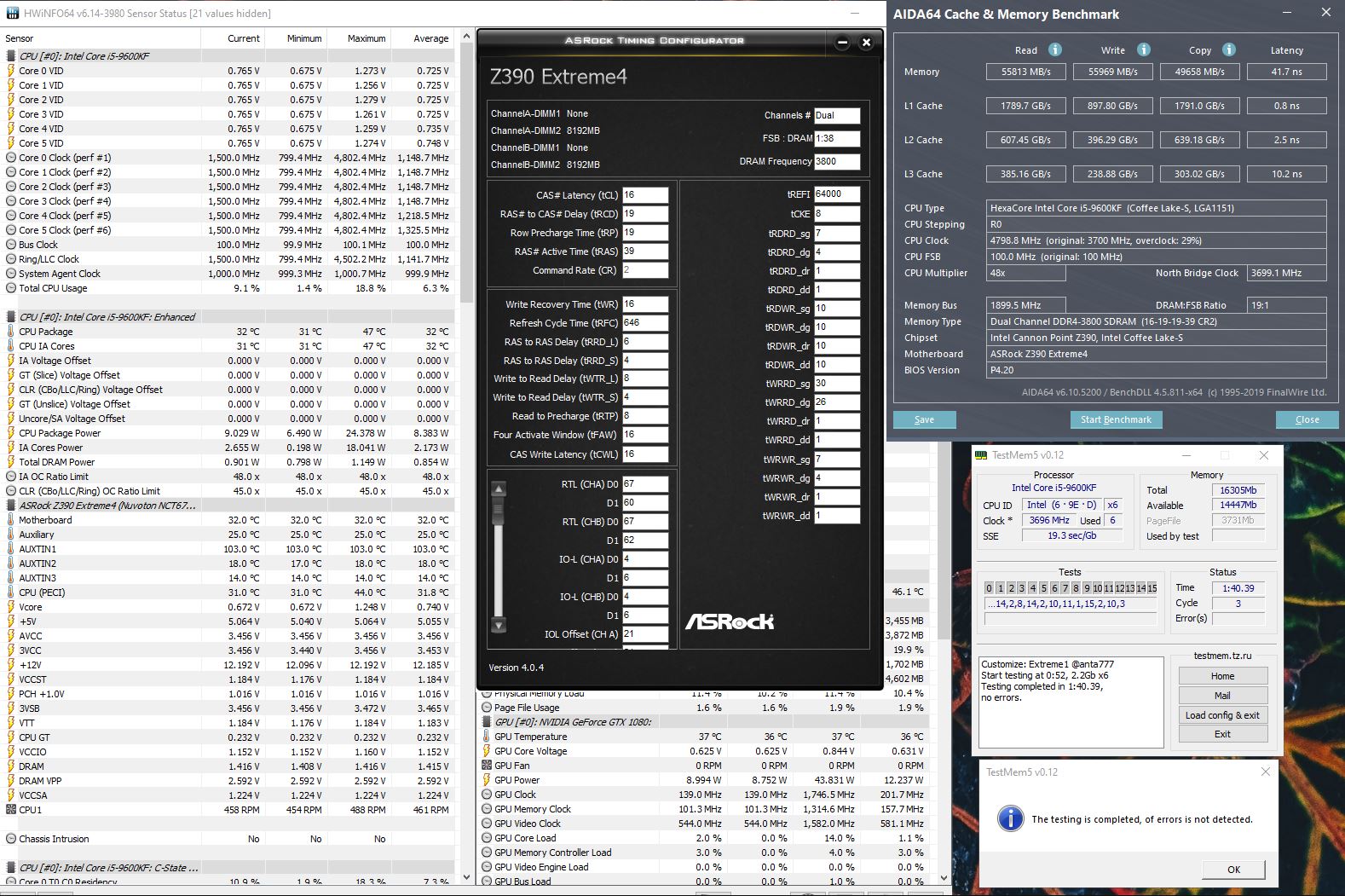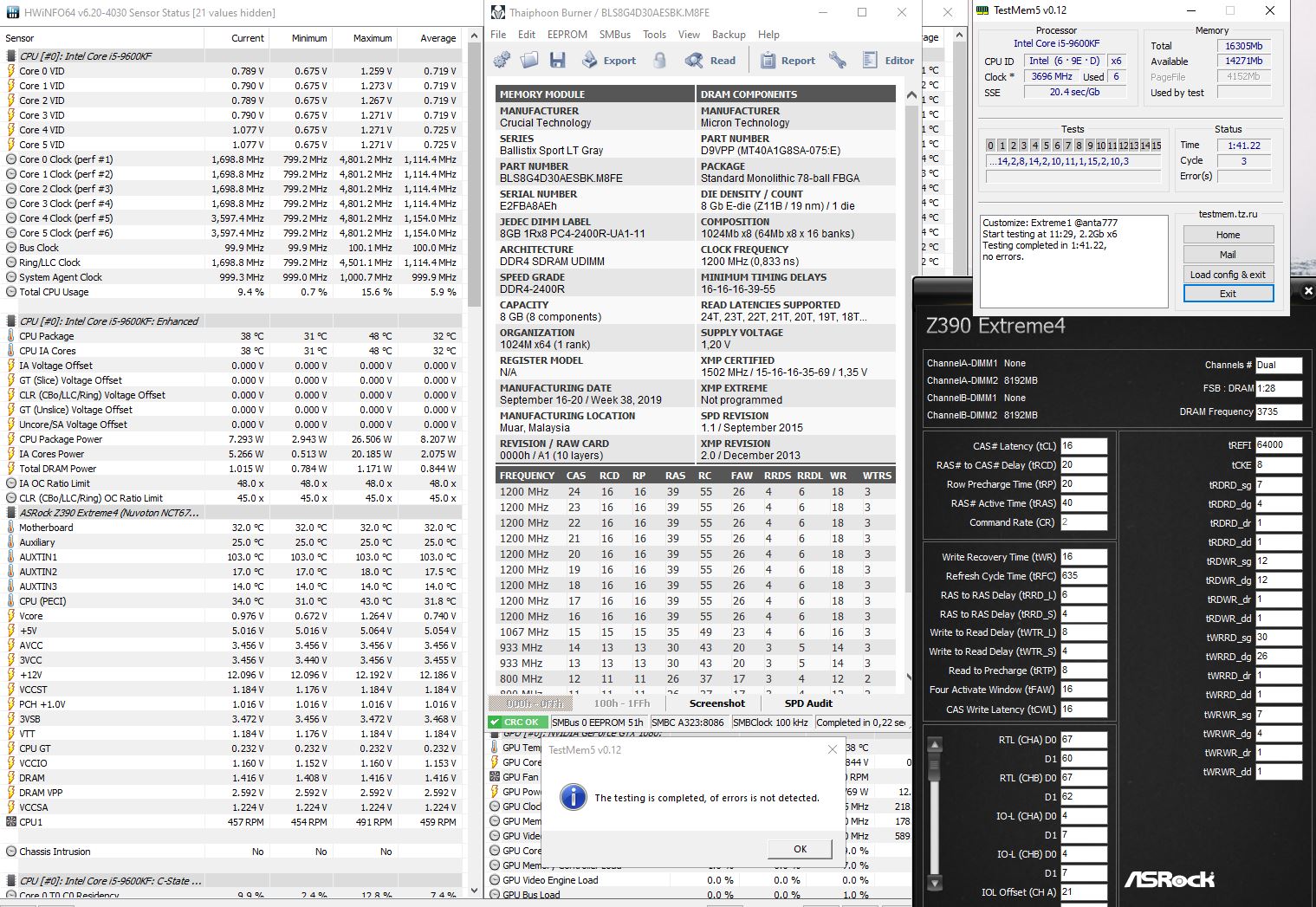 Немного помучил комплект микронов bls2k8g4d30aesbk, взяли 3733 16-20-40 при VDram 1.42 IO 1.2 SA 1.25 (позднее были снижены), первички 16-19-39 как у bls2k8g4d32aesck они осилить не смогли, но это мелочь, я не ждал что они смогут взять частоту выше 3466, точно такой же комплект у товарища на Z390 Taichi отказывался заводиться при большей частоте, плюс к этому есть видос на тытрубе где у чела только при конских значениях вольтажа они идут 3600-3800 с максимально разжатыми первичками, да и перед моим приходом в эту ветку человеку помогали с настройкой такого же комплекта именно на 3466. Так как мои bls2k8g4d32aesck не умеют в 1 по всем dr/dd, стояла цель узнать сможет ли второй комплект... ииии ему удалось