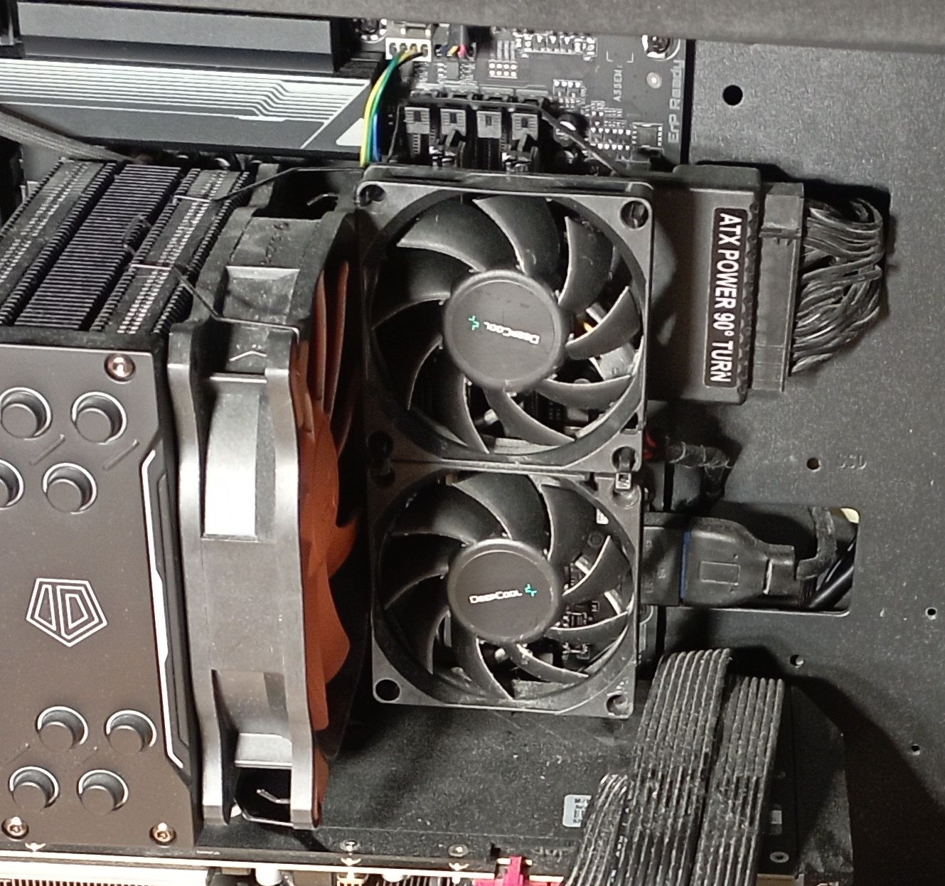 Вот моё рукоделие: На стяжках два вентилятора по 70 мм. Из упаковочной проволоки, та, что в пластике, сформировал крепление, зацепил за верхние защелки разъемов памяти, но что бы конструкция хорошо легла на планки памяти, для материнской платы понадобились два г-образных переходника, питание ATX и USB 3.0 (когда их уже начнут сбоку разводить повсеместно) Получилось дешево и сердито Думал на время, но нет ничего более постоянного, чем временное