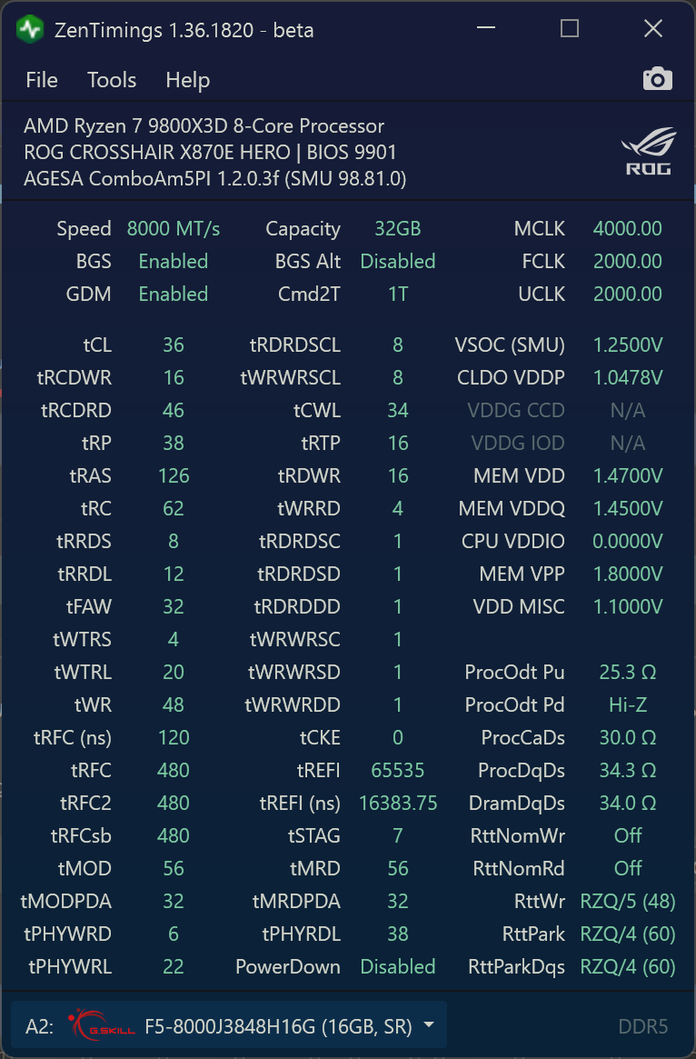 И вновь доброго вечера. После вчерашних настроек, добрался сегодня доделать дела. И всё-же получается так, что ниже 472 tRFC не проходит проверку стабильности. У меня напряжение 1.38 стоит, но по руководству Anta777 hynix M-die может 150ns, при 1.35, а у меня 157ns. Значит ли это, что даже среди M-die я попал в плохую выборку кремниевой лотереи? Или может что-то здесь выставлено неправильно? по предыдущим тестам ошибок не вылезало. Так-же смущает нюанс, из нескольких источников, что M-die по своим свойствам вообще не способны запускаться на tRFC ниже 480. Но у меня запускается. Так-же я до сих пор и не выяснил какие Die у меня чипы, так как тайфун не показывает