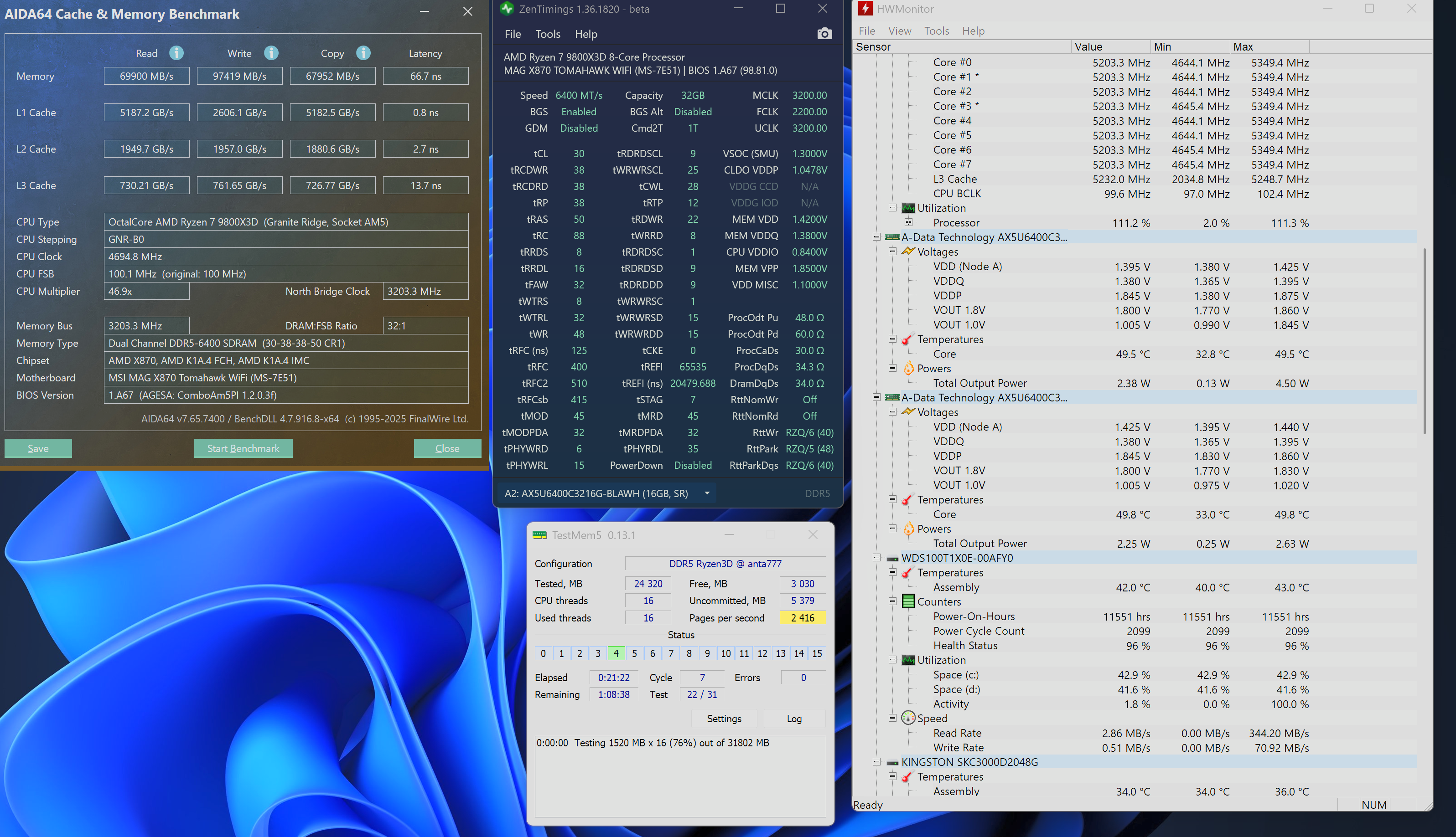 Память: ADATA XPG Lancer Blade RGB [AX5U6000C3016G-DTLABRBK] 2x16, чипы, вероятно, M-Die, а то и похуже, если такова возможность, в тайфуне инфы нет - 1 die. Температура плажек в момент теста была ~58-61. В корпусе 4 вертухи: три на вдув, один - на выдув.