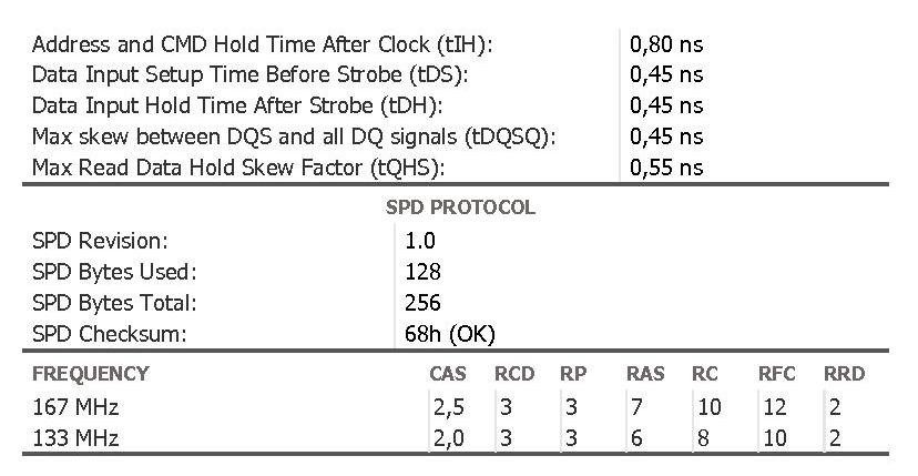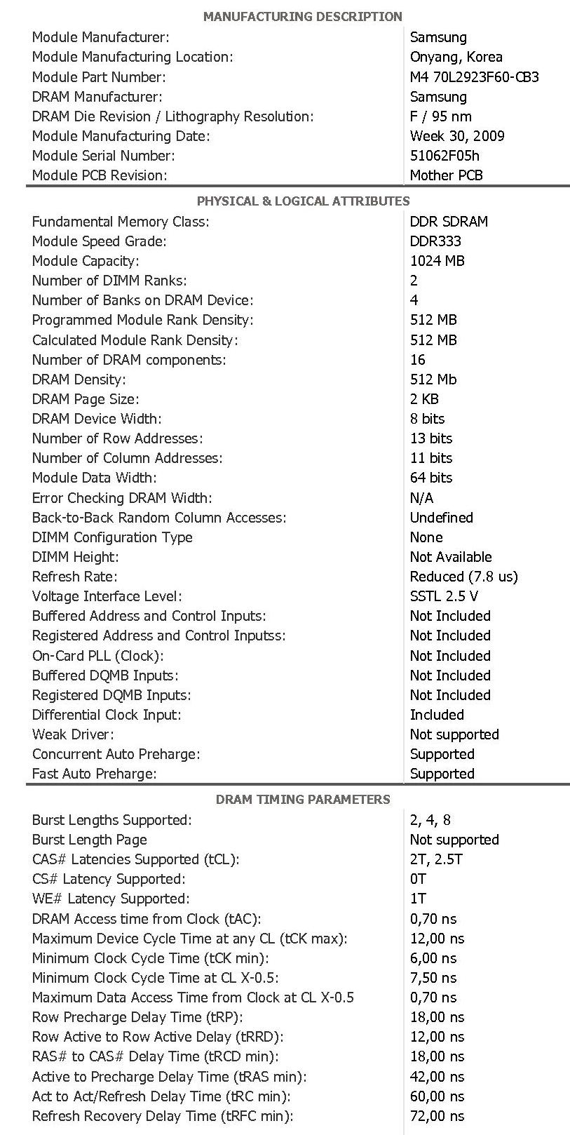 Здравствуйте, Crash! Спасибо за ответ! "Примерно" из ответа я понял так, что, возможно, к делителю "не подобраться". "Реальный" вариант, который можно попробовать - "изменить Minimum Clock Cycle Time в SPD для для наибольшего значения CAS Latency, чтобы модуль воспринимался как DDR200, т.е. с частотой 100 МГц". Для начала попробую скачать и "снять" тестами ("Тайфуном" и "вторым" - не помню название) "портрет" с карт - родных и "не очень". Посмотрю "как это выглядит". Потом буду задавать вопросы. Вероятней всего, сделаю "принтскрин" и попрошу Вас в "пайнте" подписать необходимые "циферки". У меня на втором моём (самом рабочем "старичке") чипсет "разрешает" только 2 "гектара", на форуме подсказали, что "можно и 3". Поставил по их совету. Всё заработало. Но сегодня я обратил внимание, что частота планок в тесте с АИДЫ ТОЖЕ снижена (какой-то "железкой" самостоятельно) на "шаг назад". Т.е. большая вероятность, что Ваш совет поможет. "Будете смеяться", но случайно есть даташит на процессор (в ПДФ). Если надо - отошлю. Спасибо! А как "отдать" отчеты от "Тайфуна" - они у меня в ТХТ и ХТМЛ... Сайт "не пускает" первая планка под "фамилией Самсунг" вторая планка "без фамилии"