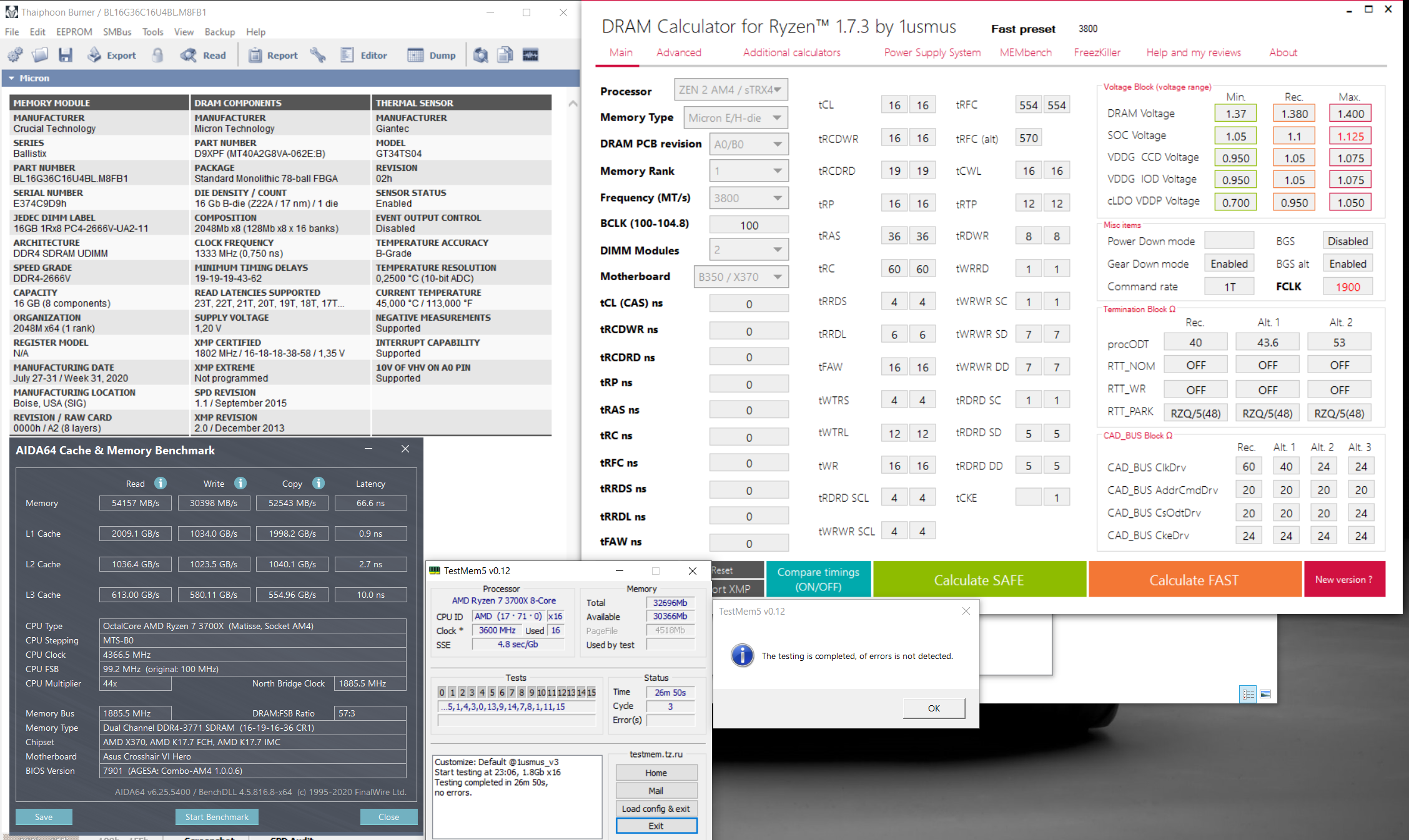 Если память не работает без ошибок (1usmus_v3) на частоте 3600 с первичными 16-19-16-16-38 и напряжени 1.40 (tCKE - 1, tRC в авто свыше 80, tRFC - 630 с чем-то), то кремниевую лотерею я проиграл? SoC пробовал 1.1 - ничего не изменилось, вернул на 1.0. Теперь вот тестирую на 1.45. Да, 1.45 - ошибок нет. Ну хоть получше узнал свою память.