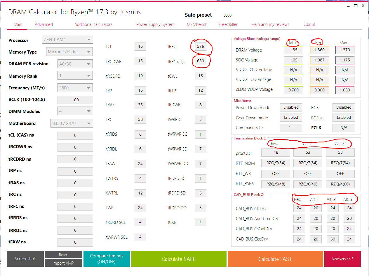 Вручную поставил CCD И IOD 1.05, VDDP 900мв, soc 1.1, напруга на память 1.42. Cad bus 120 24 24 24, procOdt 60, все остальное по калькулятору. А, и пришлось включить GDM...