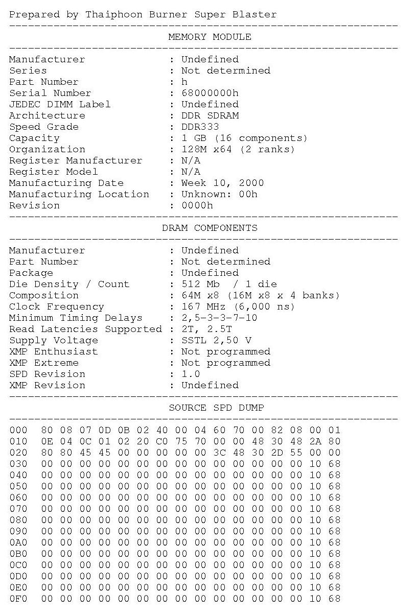 Добавлено спустя 35 минут 57 секунд: Crash, если нужно для базы могу сделать дамп памяти Kingston KHX1866C10D3-4G DDR3-1866J. Была такая у меня (теперь она у напарника, а у меня аналогичная но 8G - дамп у них практически идентичен)... Также не нашёл в базе : Kingston KHX1600C9D3-4GX DDR3-1600K with XMP, Kingston KHX1866C9D3-4GX DDR3-1333H with XMP, Patriot Memory PSD32G133381 DDR3-1333H 2gb, Kingston 99U5474-012.A00LF DDR3-1333H 2gb, Kingston 99U5458-005.A00LF DDR3-1333H 4gb, куда высылать? почту можно в ЛС...